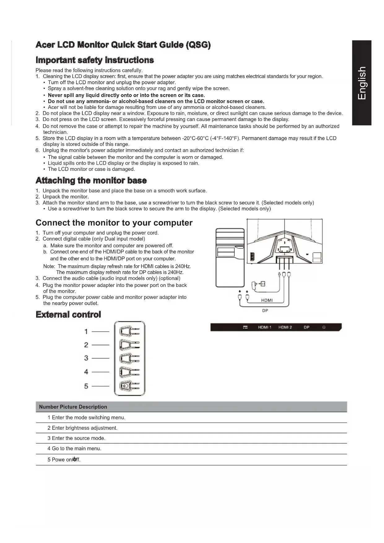 XZ320Q XZ0English Acer LCD Monitor Quick Start Guide (QSG) Important safety instructions Please read the following instructions carefully. 1. Cleaning the LCD display screen: first, ensure that the power adapter you are using matches electrical standards for your region.