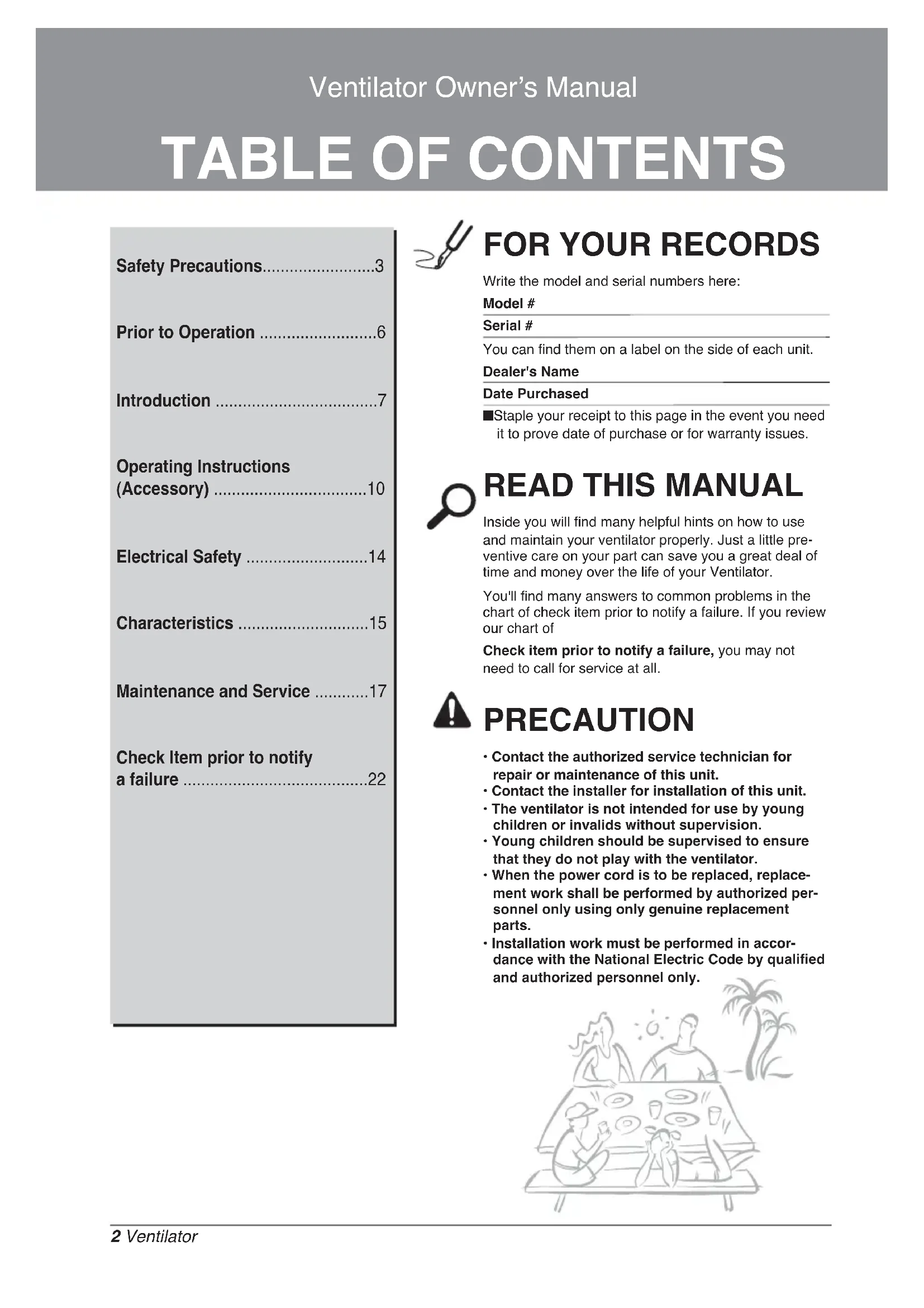 Inside you will find many helpful hints on how to useand maintain your ventilator properly. Just a little pre-ventive care on your part can save you a great deal oftime and money over the life of your Ventilator.You'll find many answers to common problems in thechart of check item prior to notify a failure. If you reviewour chart ofCheck item prior to notify a failure, you may notneed to call for service at all. PRECAUTION