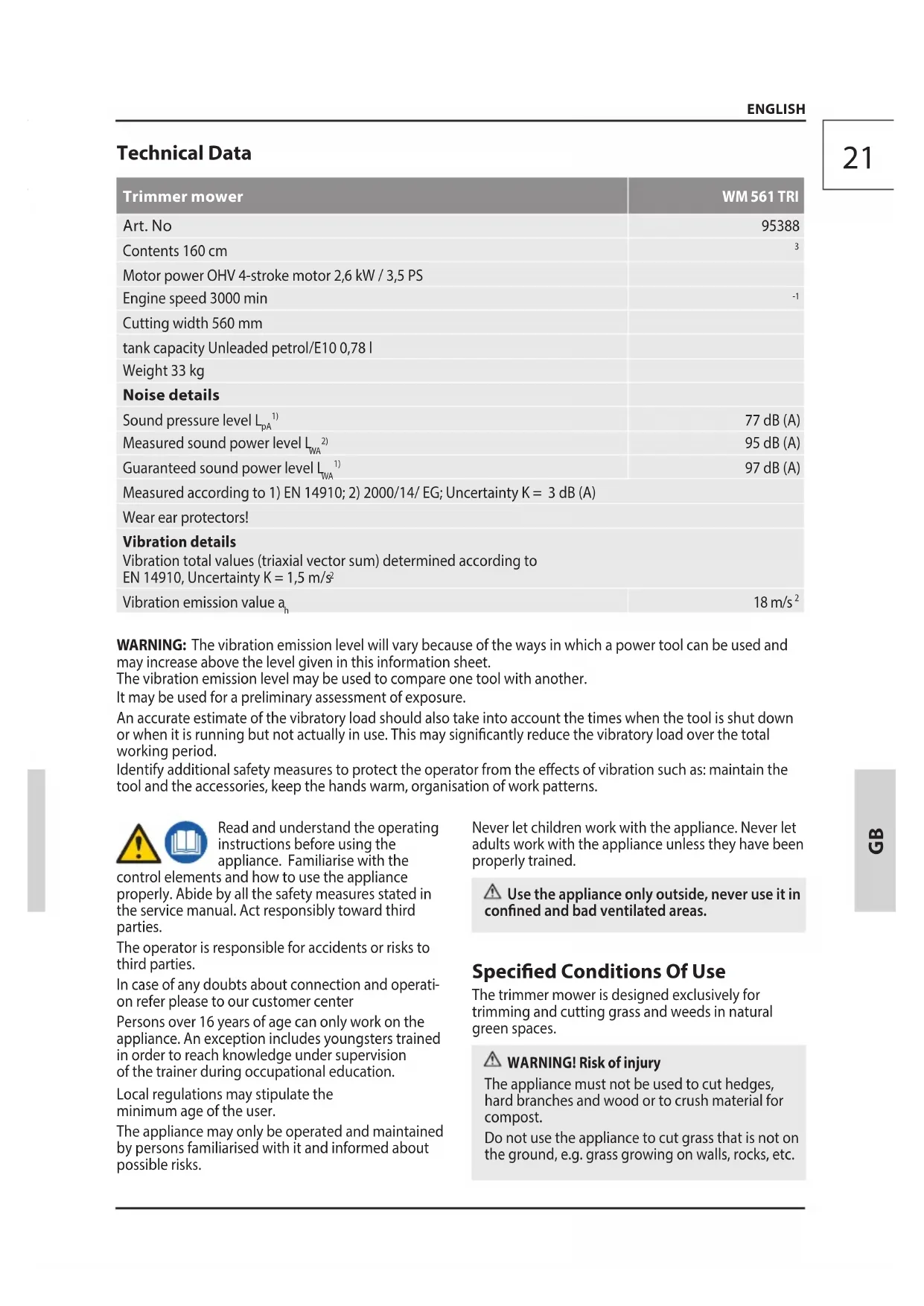 on refer please to our customer center Persons over 16 years of age can only workon the appliance.An exception includes youngsters trained in order to reachknowledge under supervision of the trainer duringoccupational education. Local regulations may stipulate the minimum age of the user. The appliance may only be operated and maintained by persons familiarised with it and informed about possible risks. Never let children work with the appliance. Never let adults work with the appliance unless they have been properly trained. Use the appliance only outside, never use it in conned and bad ventilated areas. Specied Conditions Of Use The trimmer mower is designed exclusively for trimming and cutting grass and weeds in natural green spaces. WARNING! Risk of injury The appliance must not be used to cut hedges, hard branches and wood or to crush material for compost. Do not use the appliance to cut grass that is not on the ground, e.g. grass growing on walls, rocks, etc. ENGLISH22