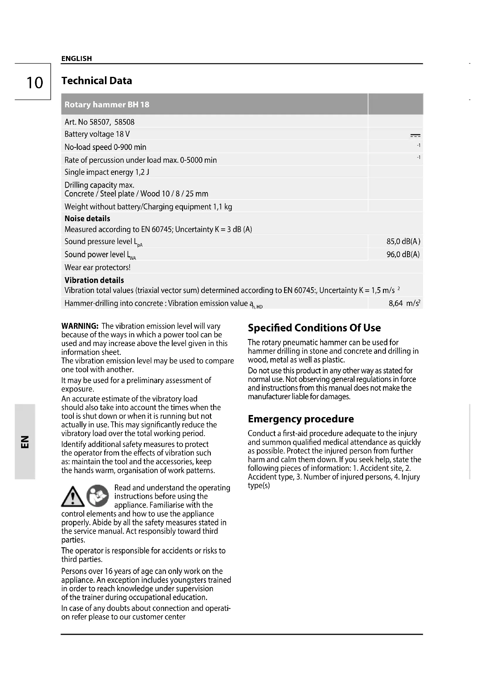 96,0 dB(A) Wear ear protectors! Vibration details Vibration total values (triaxial vector sum) determined according to EN 60745:, Uncertainty K = 1,5 m/s