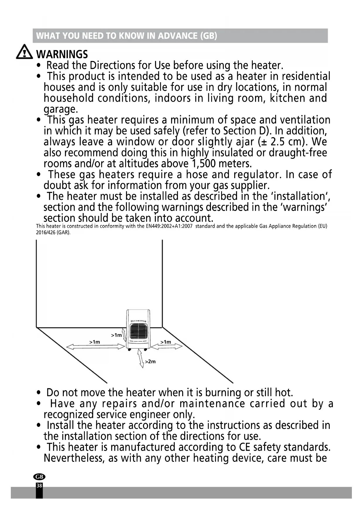 - This gas heater requires a minimum of space and ventilation in which it may be used safely (refer to Section D). In addition, always leave a window or door slightly ajar (± 2.5 cm). We also recommend doing this in highly insulated or draught-free rooms and/or at altitudes above 1,500 meters.