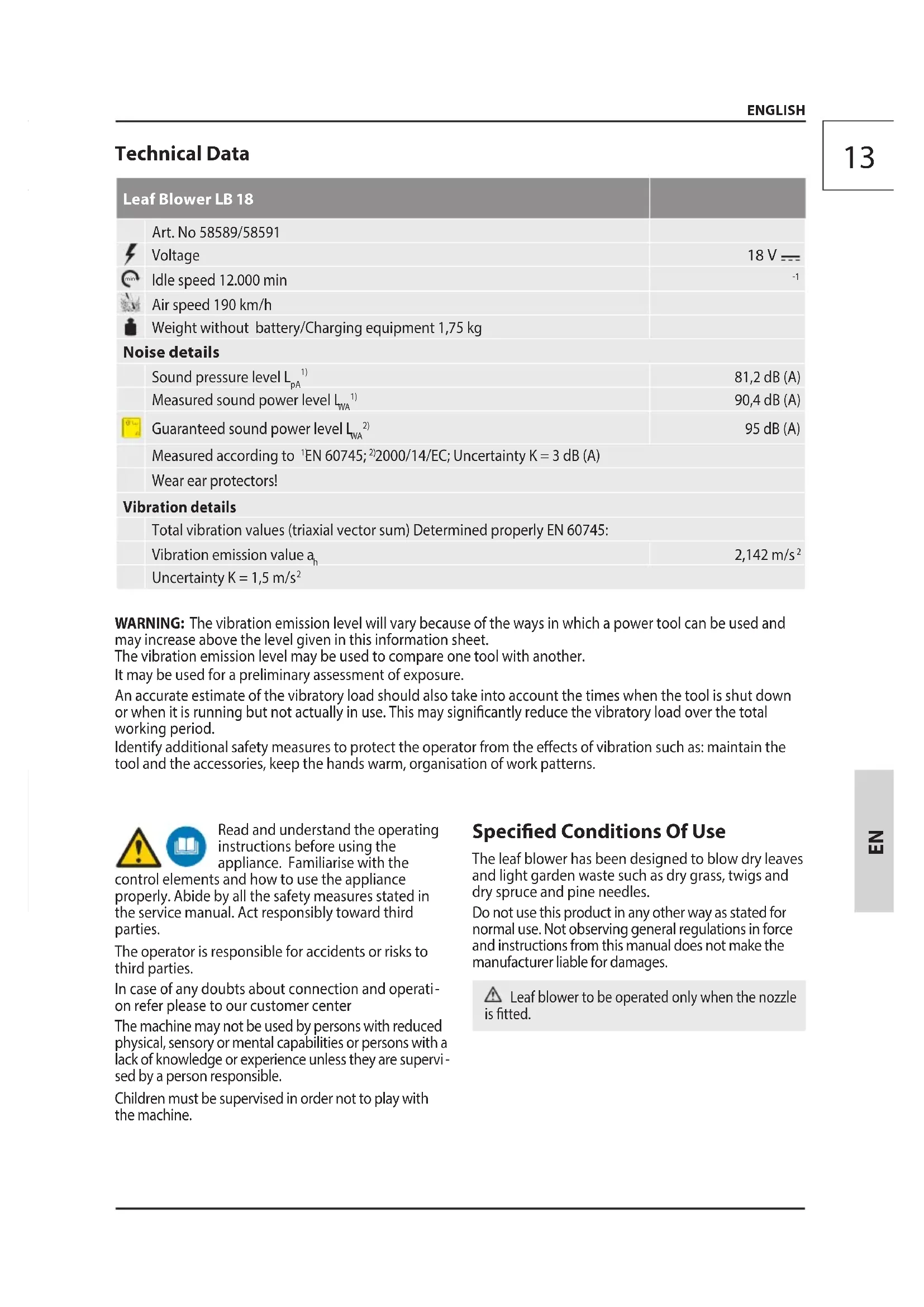 sed by a person responsible. Children must be supervised in order not to play with the machine. Specied Conditions Of Use The leaf blower has been designed to blow dry leaves and light garden waste such as dry grass, twigs and dry spruce and pine needles. Do not use this product in any other way as stated for normal use. Not observing general regulations in force and instructions from this manual does not make the manufacturer liable for damages. Leaf blower to be operated only when the nozzle is tted. Technical Data Leaf Blower LB 18 Art. No 58589/58591 Voltage 18 V min Idle speed 12.000 min