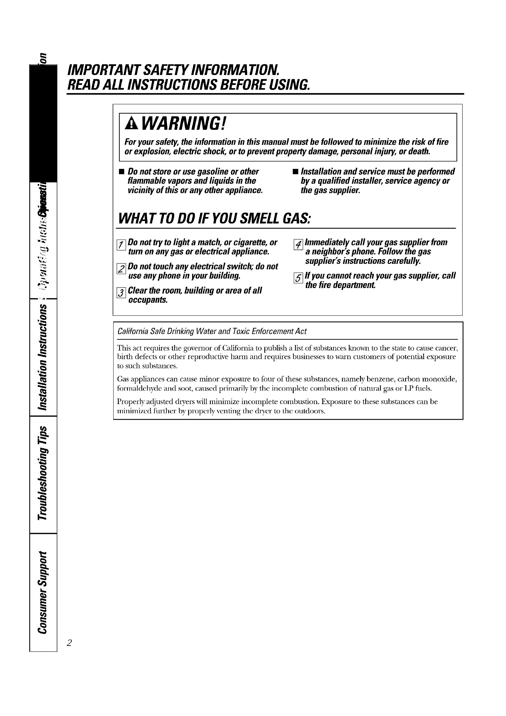 Printed in Mexico2 Consumer Support Troubleshooting Tips Operating Instructions Safety InstructionsInstallation Instructions Troubleshooting Tips Installation Instructions Safety InstructionsOperating Instructions Troubleshooting Tips Installation Instructions Safety InstructionsOperating Instructions IMPORTANT SAFETY INFORMATION. READ ALL INSTRUCTIONS BEFORE USING. California Safe Drinking Water and Toxic Enforcement ActThis act requires the governor of California to publish a list of substances known to the state to cause cancer,birth defects or other reproductive harm and requires businesses to warn customers of potential exposureto such substances.Gas appliances can cause minor exposure to four of these substances, namely benzene, carbon monoxide,formaldehyde and soot, caused primarily by the incomplete combustion of natural gas or LP fuels.Properly adjusted dryers will minimize incomplete combustion. Exposure to these substances can beminimized further by properly venting the dryer to the outdoors. WARNING! For your safety, the information in this manual must be followed to minimize the risk of fire or explosion, electric shock, or to prevent property damage, personal injury, or death. WHAT TO DO IF YOU SMELL GAS: Do not try to light a match, or cigarette, or turn on any gas or electrical appliance. Do not touch any electrical switch; do not use any phone in your building. Clear the room, building or area of all occupants. Immediately call your gas supplier from a neighbor’s phone. Follow the gas supplier’s instructions carefully. If you cannot reach your gas supplier, call the fire department.