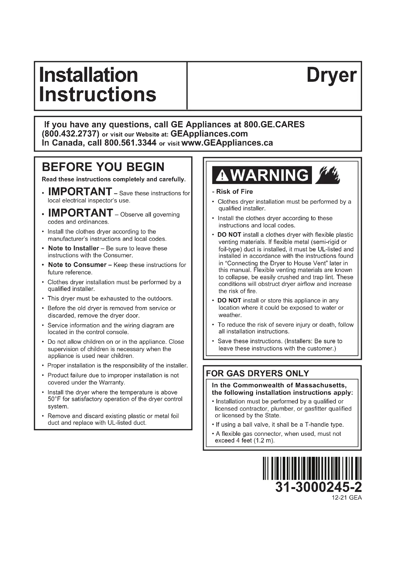 - Note to Consumer – Keep these instructions for future reference.• Clothes dryer installation must be performed by a qualified installer.• This dryer must be exhausted to the outdoors.• Before the old dryer is removed from service or discarded, remove the dryer door.• Service information and the wiring diagram are located in the control console.• Do not allow children on or in the appliance. Close supervision of children is necessary when the appliance is used near children.• Proper installation is the responsibility of the installer. • Product failure due to improper installation is not covered under the Warranty.• Install the dryer where the temperature is above 50°F for satisfactory operation of the dryer control system.• Remove and discard existing plastic or metal foil duct and replace with UL-listed duct.- Risk of Fire• Clothes dryer installation must be performed by a qualified installer.• Install the clothes dryer according to these instructions and local codes.• DO NOT install a clothes dryer with flexible plastic venting materials. If flexible metal (semi-rigid or foil-type) duct is installed, it must be UL-listed and installed in accordance with the instructions found in “Connecting the Dryer to House Vent” later in this manual. Flexible venting materials are known to collapse, be easily crushed and trap lint. These conditions will obstruct dryer airflow and increase the risk of fire.• DO NOT install or store this appliance in any location where it could be exposed to water or weather.• To reduce the risk of severe injury or death, follow all installation instructions.• Save these instructions. (Installers: Be sure to leave these instructions with the customer.) WARNING In the Commonwealth of Massachusetts, the following installation instructions apply: • Installation must be performed by a qualified or licensed contractor, plumber, or gasfitter qualified or licensed by the State.• If using a ball valve, it shall be a T-handle type.• A flexible gas connector, when used, must not exceed 4 feet (1.2 m).FOR GAS DRYERS ONLY12-21 GEA 31-3000245-2Installation Instructions Tilt the dryer sideways and remove the foam shipping pads by pulling at the sides and breaking them away from the dryer legs. Be sure to remove all of the foam pieces around the legs. Remove the bag containing the literature.