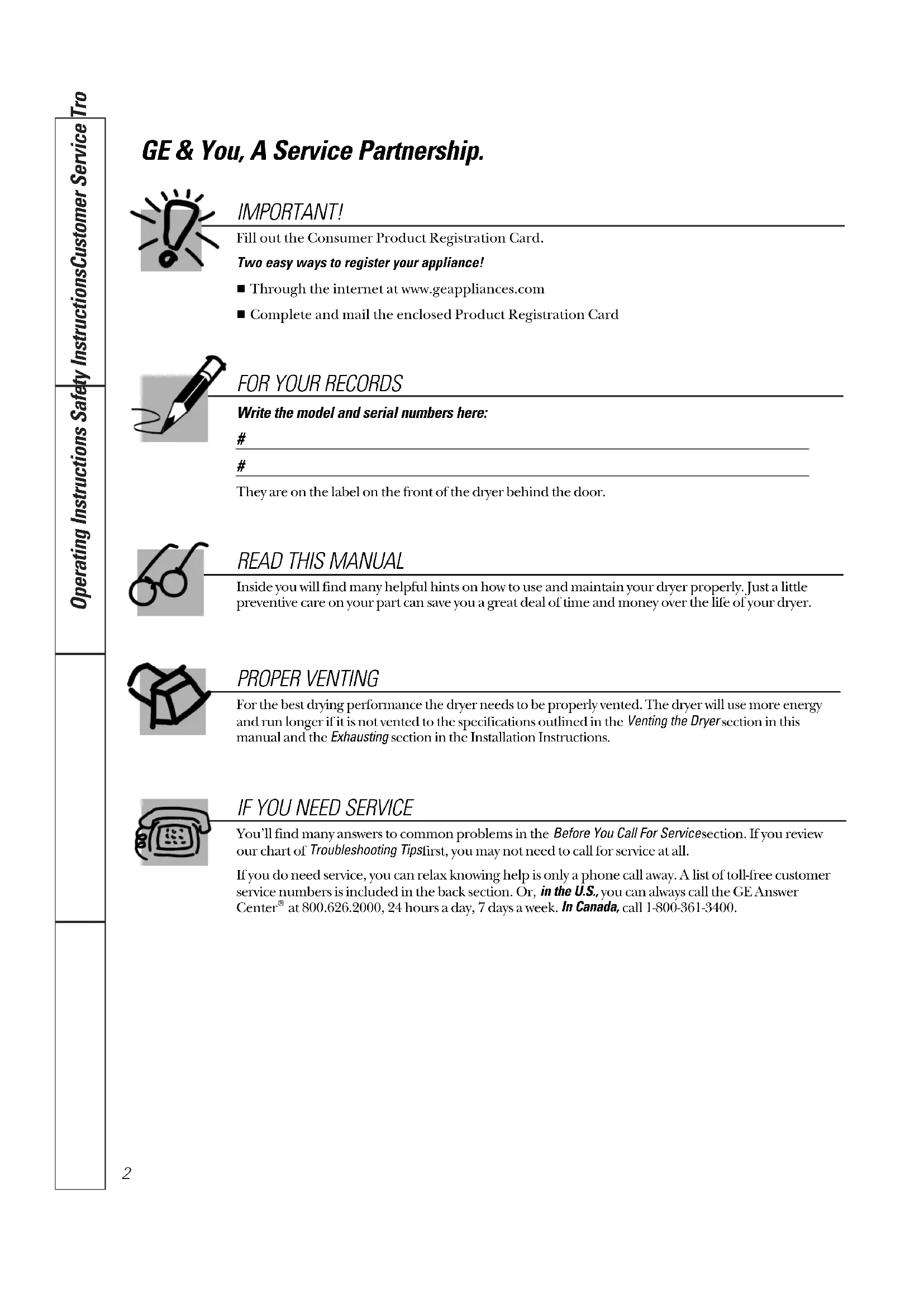 You’ll find many answers to common problems in the Before You Call For Service section. If you reviewour chart of Troubleshooting Tips first, you may not need to call for service at all.If you do need service, you can relax knowing help is only a phone call away. A list of toll-free customerservice numbers is included in the back section. Or, in the U.S., you can always call the GE AnswerCenter® at 800.626.2000, 24 hours a day, 7 days a week. In Canada, call 1-800-361-3400. IMPORTANT! Fill out the Consumer Product Registration Card.Two easy ways to register your appliance!■ Through the internet at www.geappliances.com■ Complete and mail the enclosed Product Registration Card■ Properly ground dryer to conform with allgoverning codes and ordinances. Follow details inInstallation Instructions.■ Install or store where it will not be exposed totemperatures below freezing or exposed to theweather.■ Connect to a properly rated, protected and sizedpower supply circuit to avoid electrical overload.■ Remove all sharp packing items and dispose of allshipping materials properly.Exhaust/Ducting:Gas dryers MUST be exhausted to the outside.Exhausting electric dryers to the outside isstrongly recommended to prevent large amountsof moisture and lint from being blown into theroom.Use only rigid metal or flexible metal 4″diameter ductwork inside the dryer cabinet orfor exhausting to the outside.USE OF PLASTICOR OTHER COMBUSTIBLE DUCTWORK CANCAUSE A FIRE. PUNCTURED DUCTWORK CANCAUSE A FIRE IF IT COLLAPSES OR BECOMESOTHERWISE RESTRICTED IN USE OR DURINGINSTALLATION.For complete details, follow the InstallationInstructions.