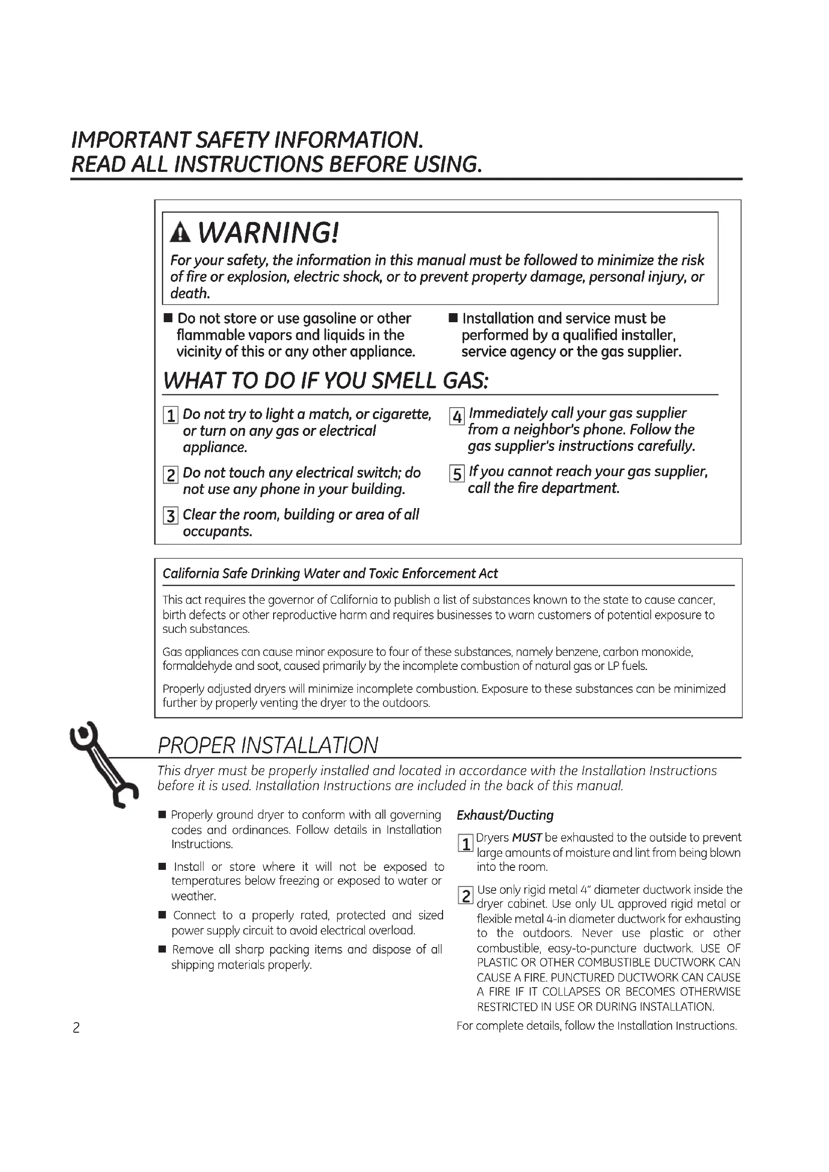 If you cannot reach your gas supplier, call the fire department. California Safe Drinking Water and Toxic Enforcement ActThis act requires the governor of California to publish a list of substances known to the state to cause cancer, birth defects or other reproductive harm and requires businesses to warn customers of potential exposure to such substances.Gas appliances can cause minor exposure to four of these substances, namely benzene, carbon monoxide, formaldehyde and soot, caused primarily by the incomplete combustion of natural gas or LP fuels.Properly adjusted dryers will minimize incomplete combustion. Exposure to these substances can be minimized further by properly venting the dryer to the outdoors. PROPER INSTALLATION This dryer must be properly installed and located in accordance with the Installation Instructions before it is used. Installation Instructions are included in the back of this manual. Do not store or use gasoline or other flammable vapors and liquids in the vicinity of this or any other appliance. Installation and service must be performed by a qualified installer, service agency or the gas supplier.