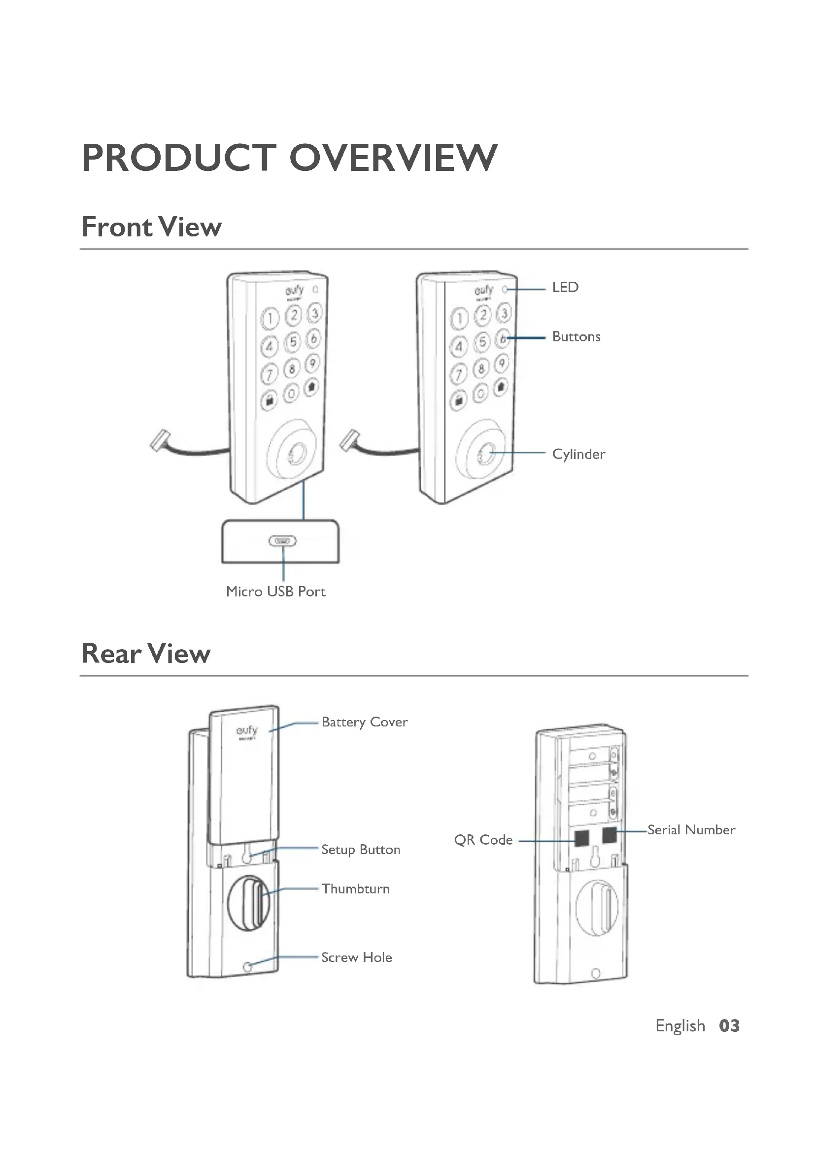 PRODUCT OVERVIEW Front View Micro USB Port LED Buttons Cylinder Rear View Battery Cover Setup Button Thumbturn Screw Hole QR Code Serial Number04 English GETTING STARTED Download eufy Security App Download the eufy Security app from the App Store (iOS devices running version