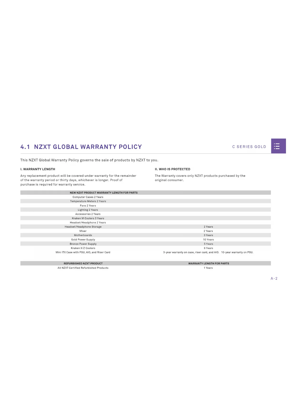 The Warranty covers only NZXT products purchased by the original consumer. NEW NZXT PRODUCT WARRANTY LENGTH FOR PARTS Computer Cases 2 Years Temperature Meters 2 Years Fans 2 Years Lighting 2 Years Accessories 2 Years Kraken M Coolers 3 Years Headset/Headphone 2 Years Headset/Headphone Storage 2 Years Mixer 2 Years Motherboards 3 Years Gold Power Supply 10 Years Bronze Power Supply 5 Years Kraken X/Z Coolers 6 Years Mini ITX Case with PSU, AIO, and Riser Card 3-year warranty on case, riser card, and AIO. 10-year warranty on PSU. REFURBISHED NZXT PRODUCT WARRANTY LENGTH FOR PARTS All NZXT Certified Refurbished Products 1 YearsA-3