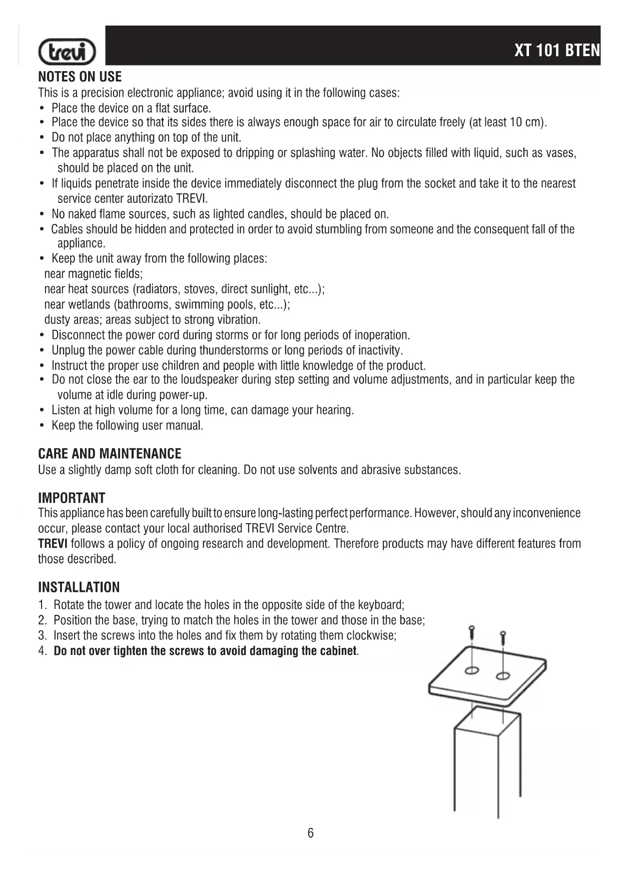 TROUBLESHOOTING If the Soundbar does not work properly, check this short list before taking it to a TREVI authorised service centre. In any case, do not try to repair the device, this will void the warranty. Only TREVI authorised service centres are authorised to perform operations on this product. No Sound: Check if MUTE function on AUX mode, or PAUSE function on USB or Bluetooth mode, are enabled. Check that the correct input has been selected. Check and adjust the volume of the Soundbar and the TV (or the device connected). ENGLISH9 XT 101 BTENGLISH The unit does not turn on or turns off automatically: Check that you have properly connected the adapter jack. If unit does not receive any signal for some time it automatically turns to standby mode. Pairing problems with Bluetooth devices: If the audio quality is poor after pairing Bluetooth with an external device, bring the external device closer to the tower or remove any obstructions between them. If the connection between the tower and the device does not occur, check that the coupling function of the device is enabled; refer to the device manual to enable the function. If the coupling with the external device is activated and deactivated continuously, bring the external device closer to the tower or remove any obstacle between them. In some external devices, the Bluetooth pairing can be switched off automatically to safeguard the consumption of its battery, this is not a malfunction of the device. I can't find the Bluetooth name of this unit on my Bluetooth device for Bluetooth pairing: Ensure that the unit is switched on. Ensure that the Bluetooth function is activated on your Bluetooth device. The device does not react to any operation: Disconnect the power cable from the device for 30 seconds to reset it. TECHNICAL FEATURES Power source: ...............................................18V 1A Output power: ...............................................40W S/N ration: ....................................................≥90db Speaker drives: .............................................2x 3inch + 1x 1inch Audio frequency: ........................................... 60Hz - 22KHz Bluetooth power transmission: ......................1mW Bluetooth transmission: .................................2,4GHz Unit size: .......................................................110x100x100mm Base size: .....................................................200x180x15mm Weight: .........................................................2,9Kg10 XT 101 BT