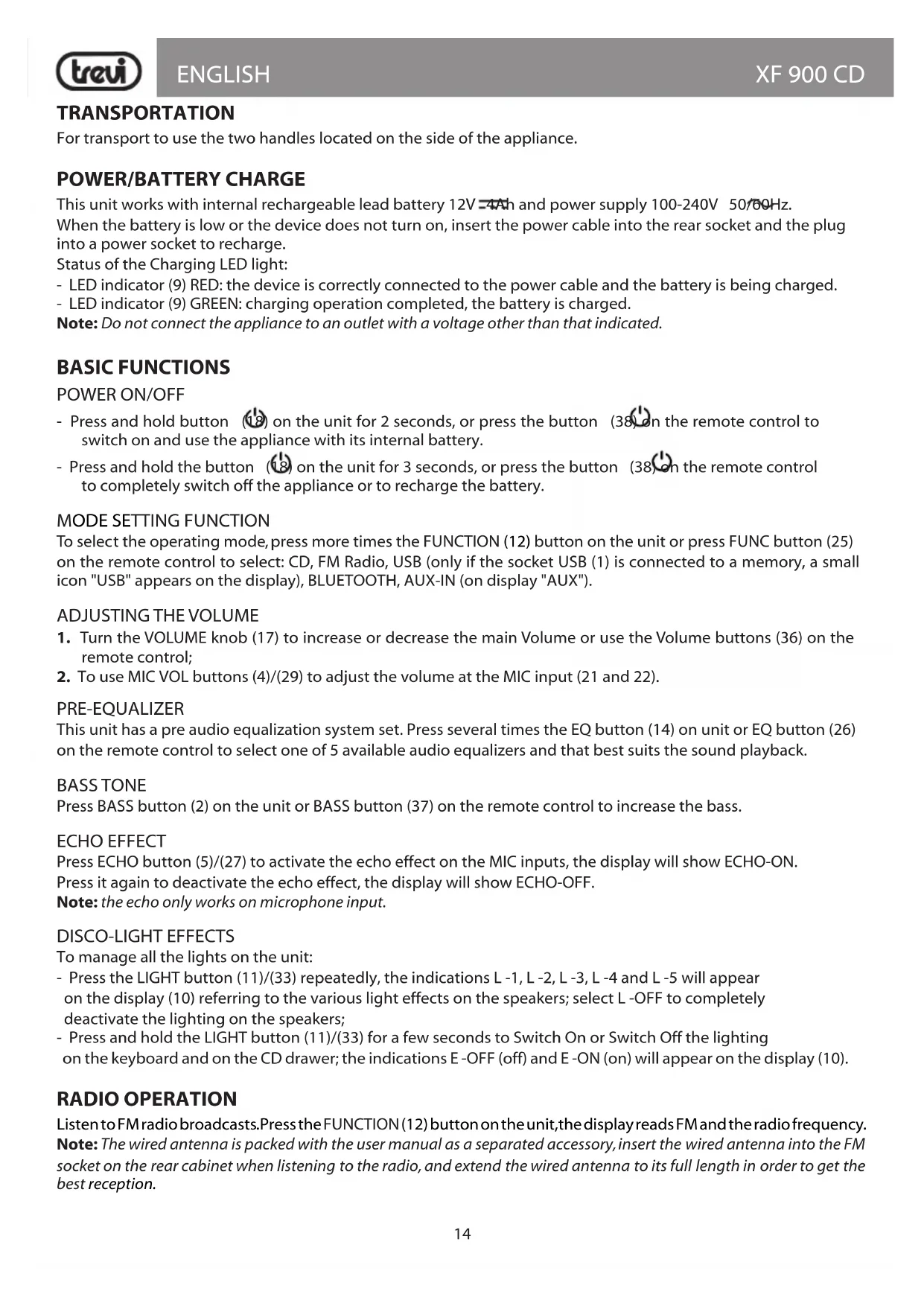 PRE-EQUALIZER This unit has a pre audio equalization system set. Press several times the EQ button (14) on unit or EQ button (26) on the remote control to select one of 5 available audio equalizers and that best suits the sound playback. BASS TONE Press BASS button (2) on the unit or BASS button (37) on the remote control to increase the bass. ECHO EFFECT Press ECHO button (5)/(27) to activate the echo effect on the MIC inputs, the display will show ECHO-ON. Press it again to deactivate the echo effect, the display will show ECHO-OFF. Note: the echo only works on microphone input. DISCO-LIGHT EFFECTS To manage all the lights on the unit: - Press the LIGHT button (11)/(33) repeatedly, the indications L -1, L -2, L -3, L -4 and L -5 will appear on the display (10) referring to the various light effects on the speakers; select L -OFF to completely deactivate the lighting on the speakers; - Press and hold the LIGHT button (11)/(33) for a few seconds to Switch On or Switch Off the lighting on the keyboard and on the CD drawer; the indications E -OFF (off) and E -ON (on) will appear on the display (10). RADIO OPERATION Listen to FM radio broadcasts. Press the FUNCTION (12) button on the unit, the display reads FM and the radio frequency. Note: The wired antenna is packed with the user manual as a separated accessory, insert the wired antenna into the FM socket on the rear cabinet when listening to the radio, and extend the wired antenna to its full length in order to get the best reception.15 XF 900 CD