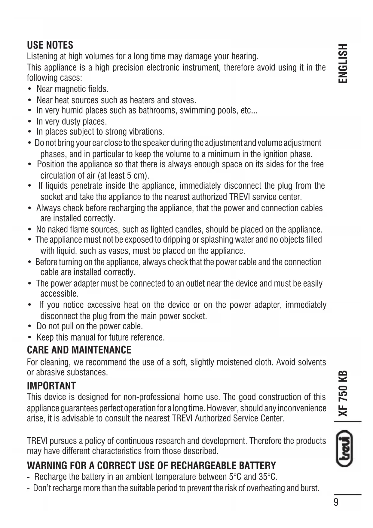 For cleaning, we recommend the use of a soft, slightly moistened cloth. Avoid solvents or abrasive substances. IMPORTANT This device is designed for non-professional home use. The good construction of this appliance guarantees perfect operation for a long time. However, should any inconvenience arise, it is advisable to consult the nearest TREVI Authorized Service Center. TREVI pursues a policy of continuous research and development. Therefore the products may have different characteristics from those described. WARNING FOR A CORRECT USE OF RECHARGEABLE BATTERY - Recharge the battery in an ambient temperature between 5°C and 35°C. - Don’t recharge more than the suitable period to prevent the risk of overheating and burst. ENGLISHXF 750 KB