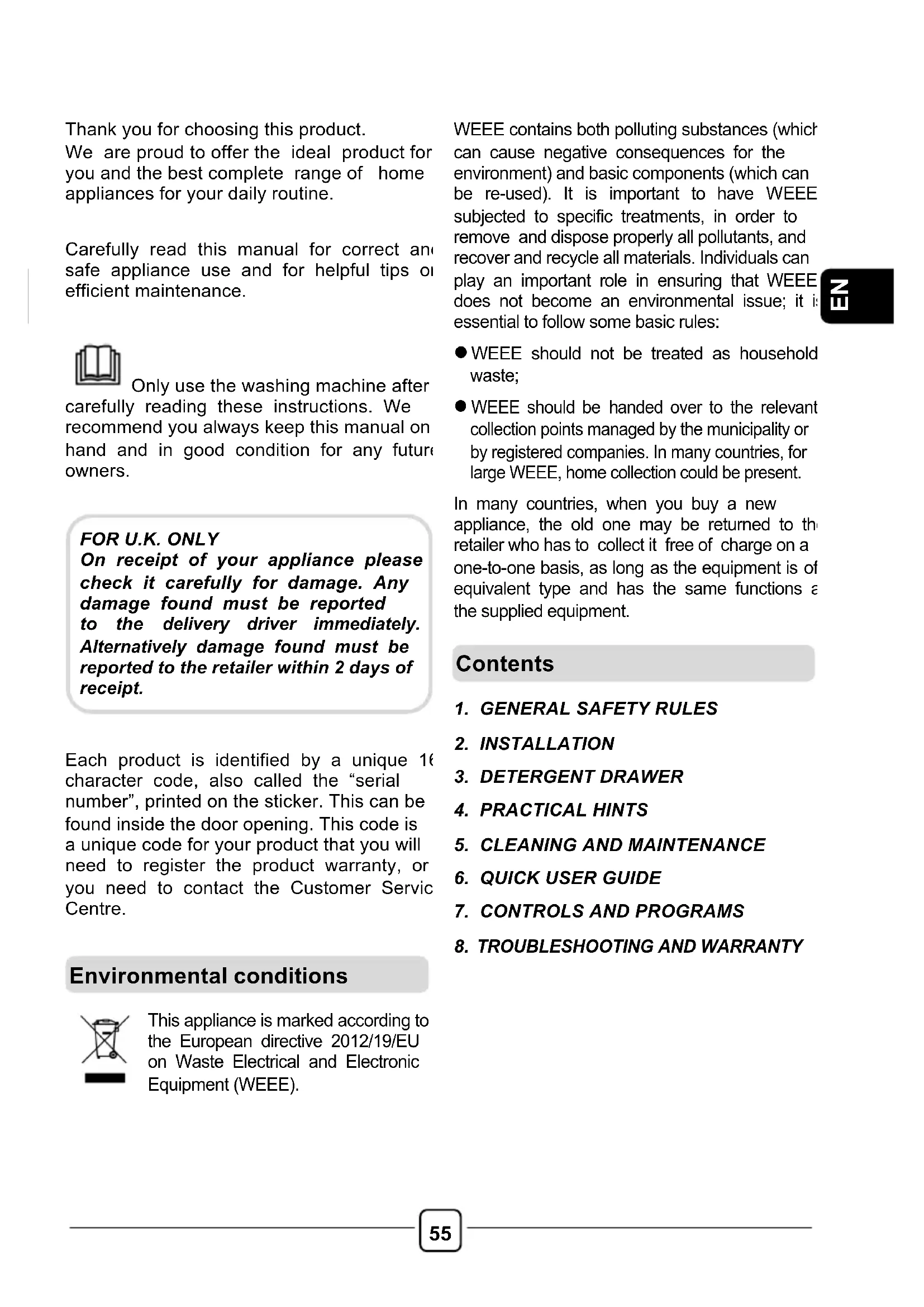 On receipt of your appliance please check it carefully for damage. Any damage found must be reported to the delivery driver immediately. Alternatively damage found must be reported to the retailer within 2 days of receipt. Environmental conditions Contents!