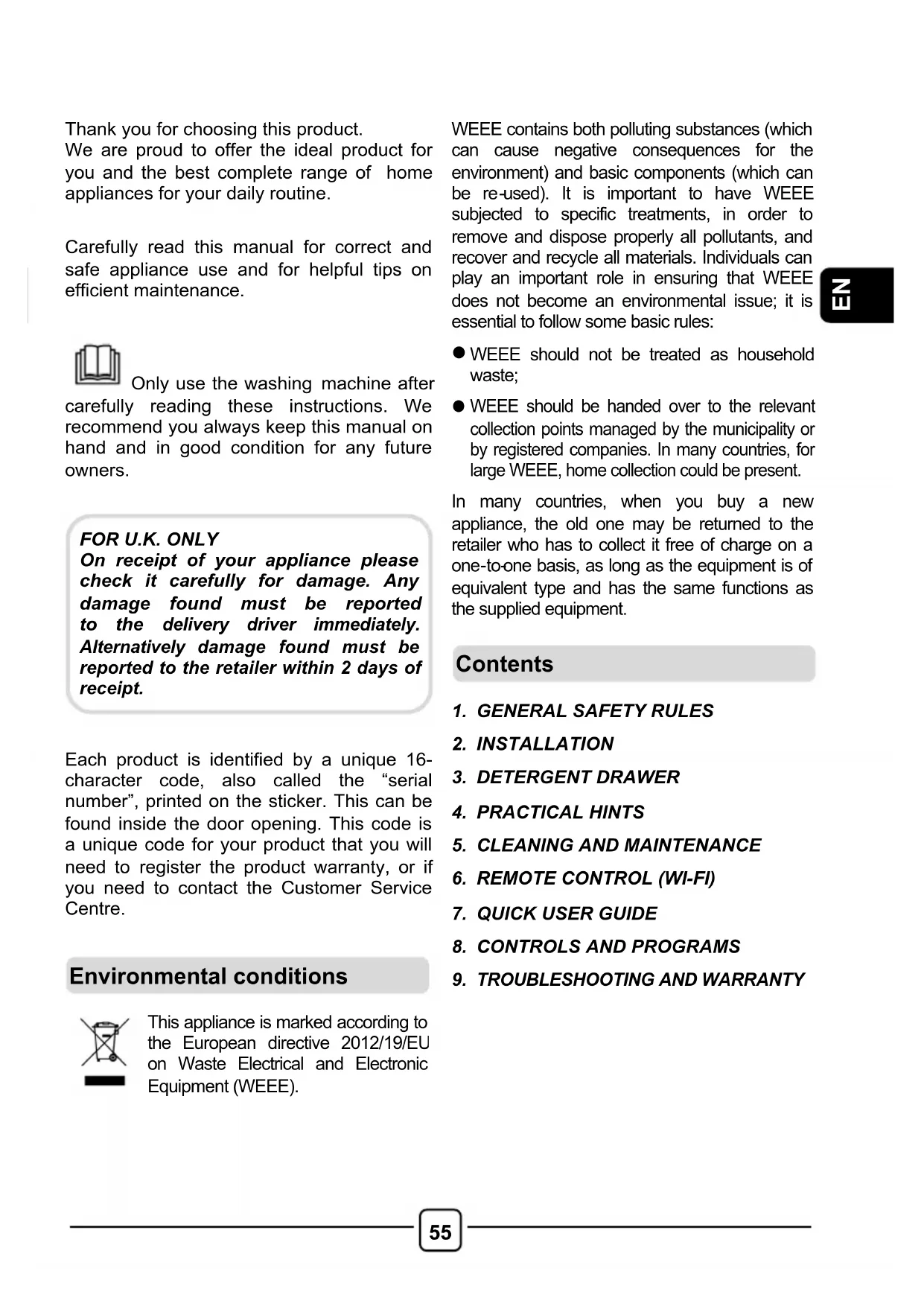 Only use the washing machine after carefully reading these instructions. We recommend you always keep this manual on hand and in good condition for any future owners.