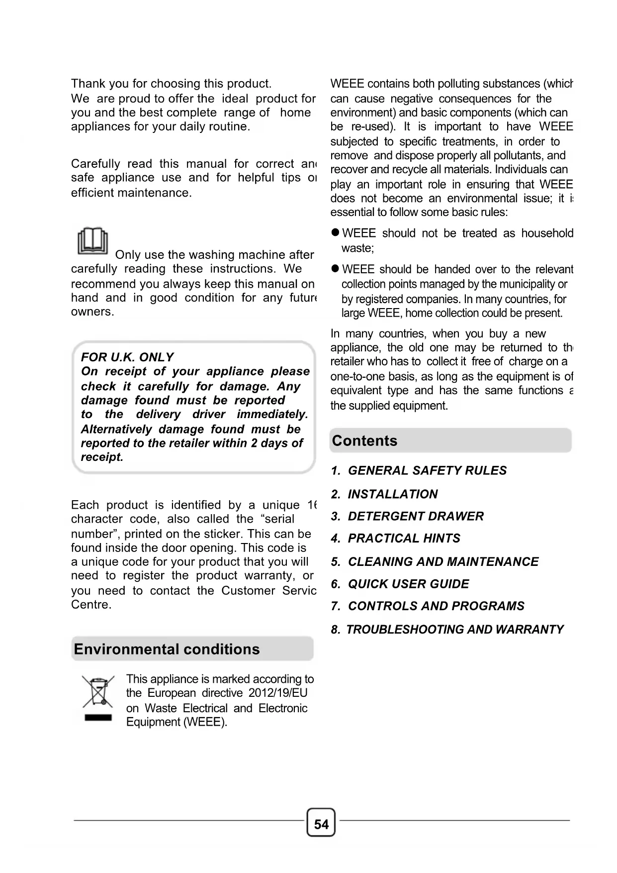 On receipt of your appliance please check it carefully for damage. Any damage found must be reported to the delivery driver immediately. Alternatively damage found must be reported to the retailer within 2 days of receipt. Environmental conditions Contents!