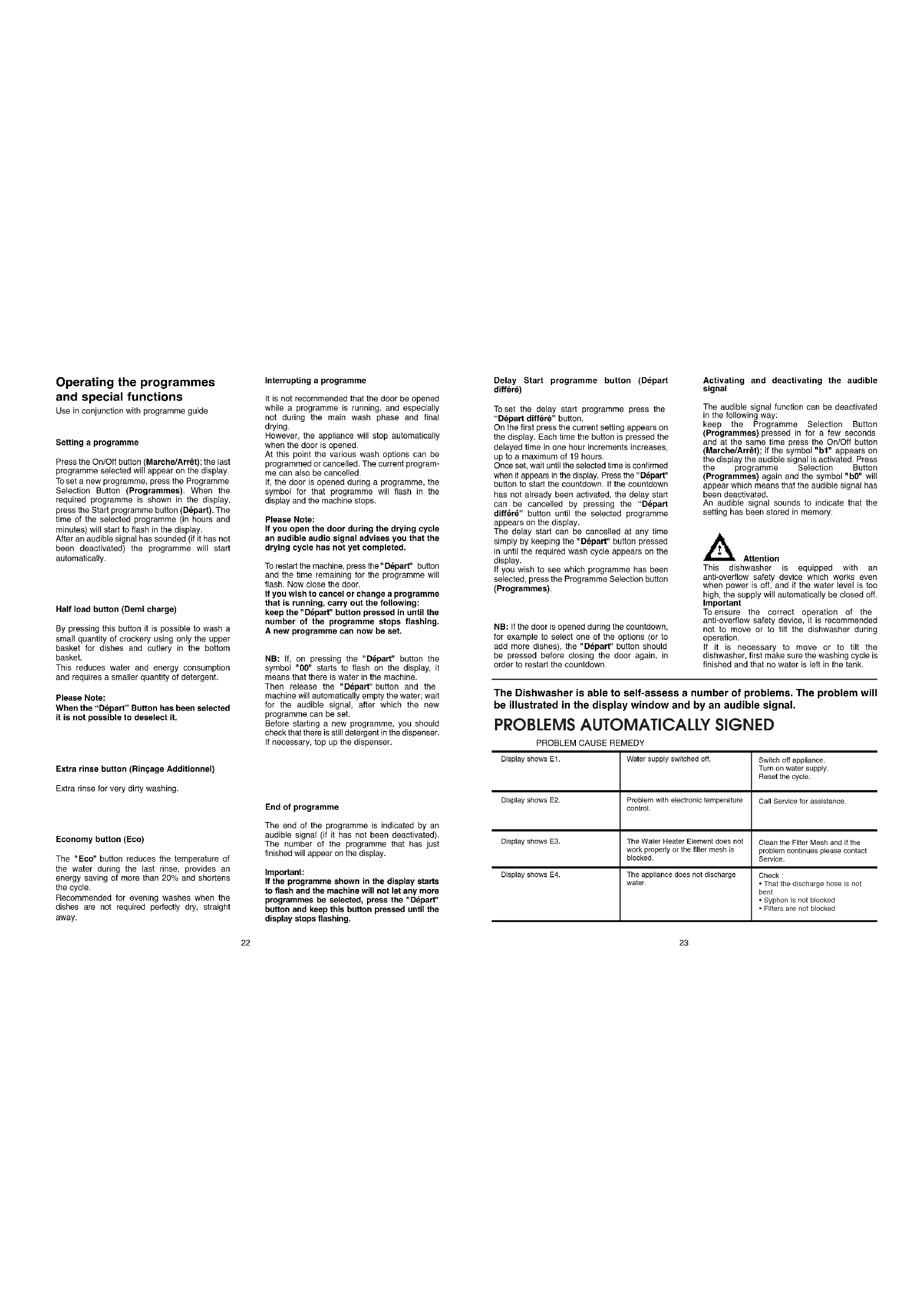 8 persons Min. 0,08 - Max 0,8 MPa (see rating plate) (see rating plate) (see rating plate)2322 Operating the programmes and special functions Use in conjunction with programme guide Setting a programme Press the On/Off button (Marche/Arrêt); the last programme selected will appear on the display. To set a new programme, press the Programme Selection Button (Programmes). When the required programme is shown in the display, press the Start programme button (Départ). The time of the selected programme (in hours and minutes) will start to flash in the display. After an audible signal has sounded (if it has not been deactivated) the programme will start automatically. Half load button (Demi charge) By pressing this button it is possible to wash a small quantity of crockery using only the upper basket for dishes and cutlery in the bottom basket. This reduces water and energy consumption and requires a smaller quantity of detergent. Please Note: When the “Départ” Button has been selected it is not possible to deselect it. Extra rinse button (Rinçage Additionnel) Extra rinse for very dirty washing. Economy button (Eco) The "Eco" button reduces the temperature of the water during the last rinse, provides an energy saving of more than 20% and shortens the cycle. Recommended for evening washes when the dishes are not required perfectly dry, straight away. Interrupting a programme It is not recommended that the door be opened while a programme is running, and especially not during the main wash phase and final drying. However, the appliance will stop automatically when the door is opened. At this point the various wash options can be programmed or cancelled. The current program- me can also be cancelled. If, the door is opened during a programme, the symbol for that programme will flash in the display and the machine stops. Please Note: If you open the door during the drying cycle an audible audio signal advises you that the drying cycle has not yet completed. To restart the machine, press the "Départ" button and the time remaining for the programme will flash. Now close the door. If you wish to cancel or change a programme that is running, carry out the following: keep the "Départ" button pressed in until the number of the programme stops flashing. A new programme can now be set. NB: If, on pressing the "Départ" button the symbol "00" starts to flash on the display, it means that there is water in the machine. Then release the "Départ" button and the machine will automatically empty the water; wait for the audible signal, after which the new programme can be set. Before starting a new programme, you should check that there is still detergent in the dispenser. If necessary, top up the dispenser. End of programme The end of the programme is indicated by an audible signal (if it has not been deactivated). The number of the programme that has just finished will appear on the display. Important: If the programme shown in the display starts to flash and the machine will not let any more programmes be selected, press the "Départ" button and keep this button pressed until the display stops flashing. Delay Start programme button (Départ différé) To set the delay start programme press the “Départ différé” button. On the first press the current setting appears on the display. Each time the button is pressed the delayed time in one hour increments increases, up to a maximum of 19 hours. Once set, wait until the selected time is confirmed when it appears in the display. Press the "Départ" button to start the countdown. If the countdown has not already been activated, the delay start can be cancelled by pressing the “Départ différé” button until the selected programme appears on the display. The delay start can be cancelled at any time simply by keeping the "Départ" button pressed in until the required wash cycle appears on the display. If you wish to see which programme has been selected, press the Programme Selection button (Programmes). NB: If the door is opened during the countdown, for example to select one of the options (or to add more dishes), the "Départ" button should be pressed before closing the door again, in order to restart the countdown. Activating and deactivating the audible signal The audible signal function can be deactivated in the following way: keep the Programme Selection Button (Programmes) pressed in for a few seconds and at the same time press the On/Off button (Marche/Arrêt); if the symbol "b1" appears on the display the audible signal is activated. Press the programme Selection Button (Programmes) again and the symbol "b0" will appear which means that the audible signal has been deactivated. An audible signal sounds to indicate that the setting has been stored in memory. Attention This dishwasher is equipped with an anti-overflow safety device which works even when power is off, and if the water level is too high, the supply will automatically be closed off. Important To ensure the correct operation of the anti-overflow safety device, it is recommended not to move or to tilt the dishwasher during operation. If it is necessary to move or to tilt the dishwasher, first make sure the washing cycle is finished and that no water is left in the tank. Display shows E1. Display shows E2. Display shows E3. Display shows E4.