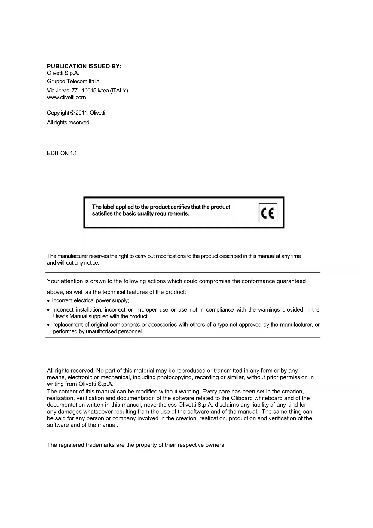 All rights reserved. No part of this material may be reproduced or transmitted in any form or by any means, electronic or mechanical, including photocopying, recording or similar, without prior permission in writing from Olivetti S.p.A. The content of this manual can be modified without warning. Every care has been set in the creation, realization, verification and documentation of the software related to the Oliboard whiteboard and of the documentation written in this manual; nevertheless Olivetti S.p.A. disclaims any liability of any kind for any damages whatsoever resulting from the use of the software and of the manual. The same thing can be said for any person or company involved in the creation, realization, production and verification of the software and of the manual.