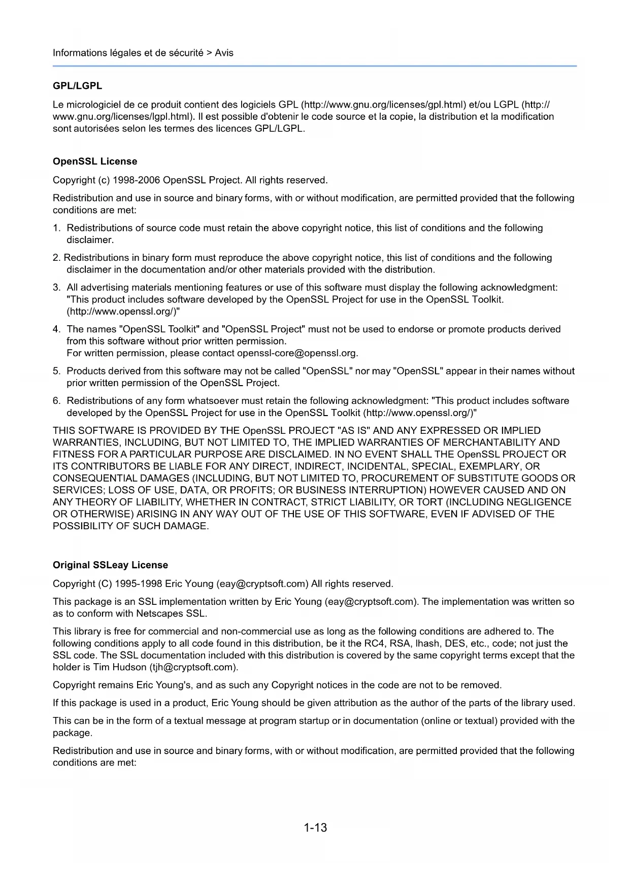 developed by the OpenSSL Project for use in the OpenSSL Toolkit (http://www.openssl.org/)" THIS SOFTWARE IS PROVIDED BY THE OpenSSL PROJECT "AS IS" AND ANY EXPRESSED OR IMPLIED WARRANTIES, INCLUDING, BUT NOT LIMITED TO, THE IMPLIED WARRANTIES OF MERCHANTABILITY AND FITNESS FOR A PARTICULAR PURPOSE ARE DISCLAIMED. IN NO EVENT SHALL THE OpenSSL PROJECT OR ITS CONTRIBUTORS BE LIABLE FOR ANY DIRECT, INDIRECT, INCIDENTAL, SPECIAL, EXEMPLARY, OR CONSEQUENTIAL DAMAGES (INCLUDING, BUT NOT LIMITED TO, PROCUREMENT OF SUBSTITUTE GOODS OR SERVICES; LOSS OF USE, DATA, OR PROFITS; OR BUSINESS INTERRUPTION) HOWEVER CAUSED AND ON ANY THEORY OF LIABILITY, WHETHER IN CONTRACT, STRICT LIABILITY, OR TORT (INCLUDING NEGLIGENCE OR OTHERWISE) ARISING IN ANY WAY OUT OF THE USE OF THIS SOFTWARE, EVEN IF ADVISED OF THE POSSIBILITY OF SUCH DAMAGE. Original SSLeay License Copyright (C) 1995-1998 Eric Young (eay@cryptsoft.com) All rights reserved. This package is an SSL implementation written by Eric Young (eay@cryptsoft.com). The implementation was written so as to conform with Netscapes SSL. This library is free for commercial and non-commercial use as long as the following conditions are adhered to. The following conditions apply to all code found in this distribution, be it the RC4, RSA, lhash, DES, etc., code; not just the SSL code. The SSL documentation included with this distribution is covered by the same copyright terms except that the holder is Tim Hudson (tjh@cryptsoft.com). Copyright remains Eric Young's, and as such any Copyright notices in the code are not to be removed. If this package is used in a product, Eric Young should be given attribution as the author of the parts of the library used. This can be in the form of a textual message at program startup or in documentation (online or textual) provided with the package. Redistribution and use in source and binary forms, with or without modification, are permitted provided that the following conditions are met:1-14 Informations légales et de sécurité > Avis 1. Redistributions of source code must retain the copyright notice, this list of conditions and the following disclaimer.