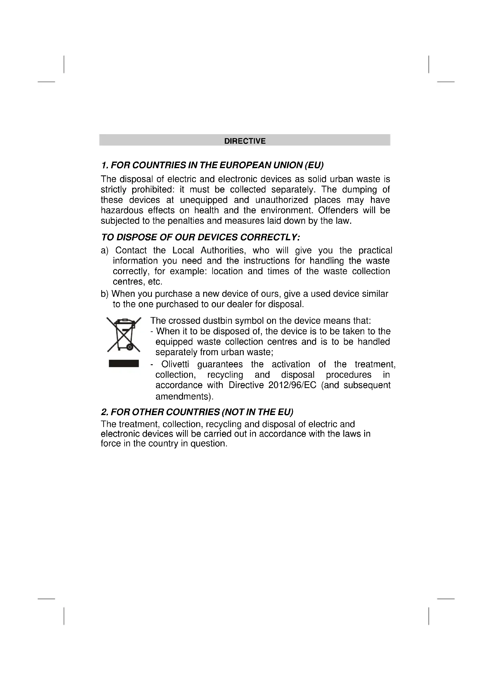 The disposal of electric and electronic devices as solid urban waste is strictly prohibited: it must be collected separately. The dumping of these devices at unequipped and unauthorized places may have hazardous effects on health and the environment. Offenders will be subjected to the penalties and measures laid down by the law. TO DISPOSE OF OUR DEVICES CORRECTLY: a) Contact the Local Authorities, who will give you the practical information you need and the instructions for handling the waste correctly, for example: location and times of the waste collection centres, etc. b) When you purchase a new device of ours, give a used device similar to the one purchased to our dealer for disposal. The crossed dustbin symbol on the device means that: - When it to be disposed of, the device is to be taken to the equipped waste collection centres and is to be handled separately from urban waste; - Olivetti guarantees the activation of the treatment, collection, recycling and disposal procedures in accordance with Directive 2012/96/EC (and subsequent amendments).
