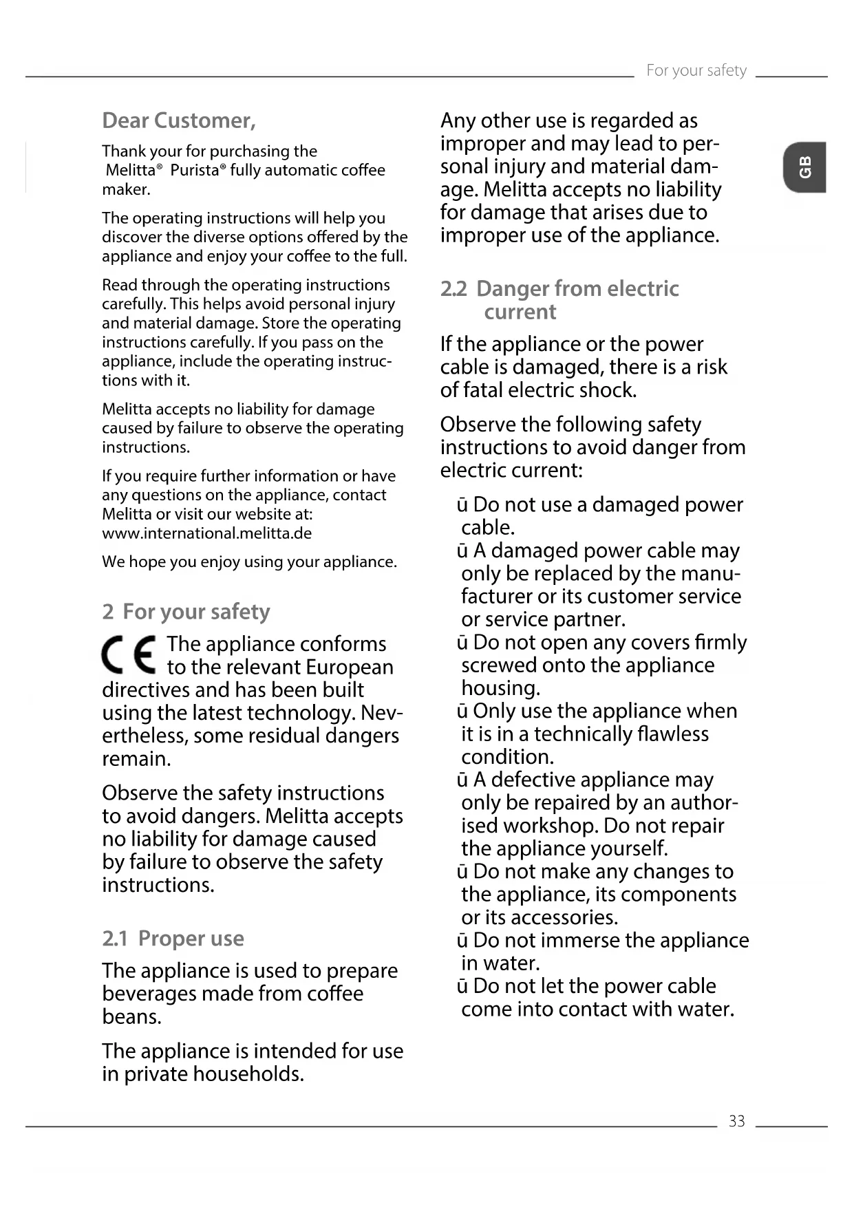 Dear Customer, Thank your for purchasing the Melitta® Purista® fully automatic coee maker. The operating instructions will help you discover the diverse options oered by the appliance and enjoy your coee to the full. Read through the operating instructions carefully. This helps avoid personal injury and material damage. Store the operating instructions carefully. If you pass on the appliance, include the operating instruc- tions with it. Melitta accepts no liability for damage caused by failure to observe the operating instructions. If you require further information or have any questions on the appliance, contact Melitta or visit our website at: www.international.melitta.de We hope you enjoy using your appliance. 2 For your safety The appliance conforms to the relevant European directives and has been built using the latest technology. Nev- ertheless, some residual dangers remain. Observe the safety instructions to avoid dangers. Melitta accepts no liability for damage caused by failure to observe the safety instructions.