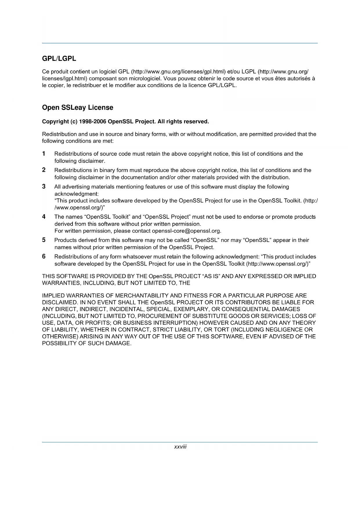 - ThinPrint est une marque déposée de ThinPrint GmbH en Allemagne et dans d'autres pays. Tous les autres noms de marques et de produits sont des marques ou des marques déposées appartenant à leurs propriétaires respectifs. Les symboles ™ et ® ne sont pas employés dans ce manuel d'utilisation.xxviii GPL/LGPL Ce produit contient un logiciel GPL (http://www.gnu.org/licenses/gpl.html) et/ou LGPL (http://www.gnu.org/ licenses/lgpl.html) composant son micrologiciel. Vous pouvez obtenir le code source et vous êtes autorisés à le copier, le redistribuer et le modifier aux conditions de la licence GPL/LGPL. Open SSLeay License Copyright (c) 1998-2006 OpenSSL Project. All rights reserved. Redistribution and use in source and binary forms, with or without modification, are permitted provided that the following conditions are met: 1 Redistributions of source code must retain the above copyright notice, this list of conditions and the following disclaimer. 2 Redistributions in binary form must reproduce the above copyright notice, this list of conditions and the following disclaimer in the documentation and/or other materials provided with the distribution. 3 All advertising materials mentioning features or use of this software must display the following acknowledgment: “This product includes software developed by the OpenSSL Project for use in the OpenSSL Toolkit. (http:/ /www.openssl.org/)” 4 The names “OpenSSL Toolkit” and “OpenSSL Project” must not be used to endorse or promote products derived from this software without prior written permission. For written permission, please contact openssl-core@openssl.org. 5 Products derived from this software may not be called “OpenSSL” nor may “OpenSSL” appear in their names without prior written permission of the OpenSSL Project. 6 Redistributions of any form whatsoever must retain the following acknowledgment: “This product includes software developed by the OpenSSL Project for use in the OpenSSL Toolkit (http://www.openssl.org/)” THIS SOFTWARE IS PROVIDED BY THE OpenSSL PROJECT “AS IS” AND ANY EXPRESSED OR IMPLIED WARRANTIES, INCLUDING, BUT NOT LIMITED TO, THE IMPLIED WARRANTIES OF MERCHANTABILITY AND FITNESS FOR A PARTICULAR PURPOSE ARE DISCLAIMED. IN NO EVENT SHALL THE OpenSSL PROJECT OR ITS CONTRIBUTORS BE LIABLE FOR ANY DIRECT, INDIRECT, INCIDENTAL, SPECIAL, EXEMPLARY, OR CONSEQUENTIAL DAMAGES (INCLUDING, BUT NOT LIMITED TO, PROCUREMENT OF SUBSTITUTE GOODS OR SERVICES; LOSS OF USE, DATA, OR PROFITS; OR BUSINESS INTERRUPTION) HOWEVER CAUSED AND ON ANY THEORY OF LIABILITY, WHETHER IN CONTRACT, STRICT LIABILITY, OR TORT (INCLUDING NEGLIGENCE OR OTHERWISE) ARISING IN ANY WAY OUT OF THE USE OF THIS SOFTWARE, EVEN IF ADVISED OF THE POSSIBILITY OF SUCH DAMAGE.xxix Original SSLeay License Copyright (C) 1995-1998 Eric Young (eay@cryptsoft.com) Touts droits réservés. This package is an SSL implementation written by Eric Young (eay@cryptsoft.com). The implementation was written so as to conform with Netscapes SSL. This library is free for commercial and non-commercial use as long as the following conditions are aheared to. The following conditions apply to all code found in this distribution, be it the RC4, RSA, lhash, DES, etc., code; not just the SSL code. The SSL documentation included with this distribution is covered by the same copyright terms except that the holder is Tim Hudson (tjh@cryptsoft.com). Copyright remains Eric Young’s, and as such any Copyright notices in the code are not to be removed. If this package is used in a product, Eric Young should be given attribution as the author of the parts of the library used. This can be in the form of a textual message at program startup or in documentation (online or textual) provided with the package. Redistribution and use in source and binary forms, with or without modification, are permitted provided that the following conditions are met: 1 Redistributions of source code must retain the copyright notice, this list of conditions and the following disclaimer. 2 Redistributions in binary form must reproduce the above copyright notice, this list of conditions and the following disclaimer in the documentation and/or other materials provided with the distribution. 3 All advertising materials mentioning features or use of this software must display the following acknowledgement: “This product includes cryptographic software written by Eric Young (eay@cryptsoft.com)” The word ‘cryptographic’ can be left out if the rouines from the library being used are not cryptographic related :-). 4 If you include any Windows specific code (or a derivative thereof) from the apps directory (application code) you must include an acknowledgement: “This product includes software written by Tim Hudson (tjh@cryptsoft.com)” THIS SOFTWARE IS PROVIDED BY ERIC YOUNG “AS IS” AND ANY EXPRESS OR IMPLIED WARRANTIES, INCLUDING, BUT NOT LIMITED TO, THE IMPLIED WARRANTIES OF MERCHANTABILITY AND FITNESS FOR A PARTICULAR PURPOSE ARE DISCLAIMED. IN NO EVENT SHALL THE AUTHOR OR CONTRIBUTORS BE LIABLE FOR ANY DIRECT, INDIRECT, INCIDENTAL, SPECIAL, EXEMPLARY, OR CONSEQUENTIAL DAMAGES (INCLUDING, BUT NOT LIMITED TO, PROCUREMENT OF SUBSTITUTE GOODS OR SERVICES; LOSS OF USE, DATA, OR PROFITS; OR BUSINESS INTERRUPTION) HOWEVER CAUSED AND ON ANY THEORY OF LIABILITY, WHETHER IN CONTRACT, STRICT LIABILITY, OR TORT (INCLUDING NEGLIGENCE OR OTHERWISE) ARISING IN ANY WAY OUT OF THE USE OF THIS SOFTWARE, EVEN IF ADVISED OF THE POSSIBILITY OF SUCH DAMAGE. The licence and distribution terms for any publically available version or derivative of this code cannot be changed. i.e. this code cannot simply be copied and put under another distribution licence [including the GNU Public Licence.]xxx Monotype Imaging License Agreement 1 Software shall mean the digitally encoded, machine readable, scalable outline data as encoded in a special format as well as the UFST Software. 2 You agree to accept a non-excl