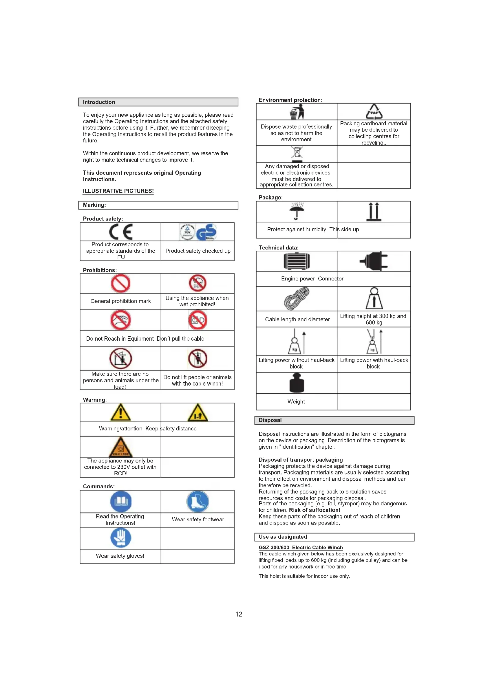 Warning/attention Keep safety distance The appliance may only be connected to 230V outlet with RCD! Commands: Read the Operating Instructions! Wear safety footwear Wear safety gloves! Environment protection: Dispose waste professionally so as not to harm the environment. Packing cardboard material may be delivered to collecting centres for recycling.. Any damaged or disposed electric or electronic devices must be delivered to appropriate collection centres. Package: Protect against humidity This side up Technical data: Engine power Connector Cable length and diameter Lifting height at 300 kg and 600 kg Lifting power without haul-back block Lifting power with haul-back block Weight Disposal Disposal instructions are illustrated in the form of pictograms on the device or packaging. Description of the pictograms is given in "Identification" chapter. Disposal of transport packaging Packaging protects the device against damage during transport. Packaging materials are usually selected according to their effect on environment and disposal methods and can therefore be recycled. Returning of the packaging back to circulation saves resources and costs for packaging disposal. Parts of the packaging (e.g. foil, styropor) may be dangerous for children. Risk of suffocation! Keep these parts of the packaging out of reach of children and dispose as soon as possible. Use as designated GSZ 300/600 Electric Cable Winch The cable winch given below has been exclusively designed for lifting fixed loads up to 600 kg (including guide pulley) and can be used for any housework or in free time. This hoist is suitable for indoor use only. 12The unit must not be used in agriculture. The appliance cannot be used for works other than for which the appliance has been designed and that are specified in the Operating Instructions. Any other use will be considered a use in conflict with the designation. The manufacturer will not be liable for any consequential damage and injuries. Please be sure to know that the appliance has not been designed for industrial purposes. Supply includes Take the appliance out of the transport package and check it whether there are the following parts: 1 piece Idler 4 pieces hex screws 2 pieces fixing clamps 1 piece User Guide Please contact your dealer if any parts are missing or are damaged. Appliance description (pic. 1 and 2) a Fixing clamp b Hex screw c Tension clamp d Burden hook e Limit switch for lifting f Engine g Switch body h Controller i Safety switch j Hook holder k Cable drum l Tension weight m Steel cable n Idler o Bracket p Limit switch for sinking Warranty A warranty period of 12 months applies to commercial use and 24 months apply to private use and commences on the day of purchase of the device. Warranty applies exclusively to failures due to defective material or workmanship. An original sale slip with indication of date of sale must be presented in case of claiming for the warranty rights. Warranty does not cover unprofessional use such as device overload, violent use, damage caused by third party or foreign materials, failure to comply with operations and assembly manual, and normal wear and tear. Important basic safety instructions Before you start working with the appliance please read carefully the following safety regulations and Operating Instructions. If any other person is to handle the appliance provide him/her with the Operating Instructions. Keep the Operating Instructions for future reference! Package: The appliance has been put in a package to prevent any damage during transport. Packages are raw materials so they can be reused or recycled. Please read carefully the Operating Instructions and follow them. Use these Operating Instructions to get acquainted with the appliance, its corresponding use and safety instructions. Keep the Instructions for future reference.