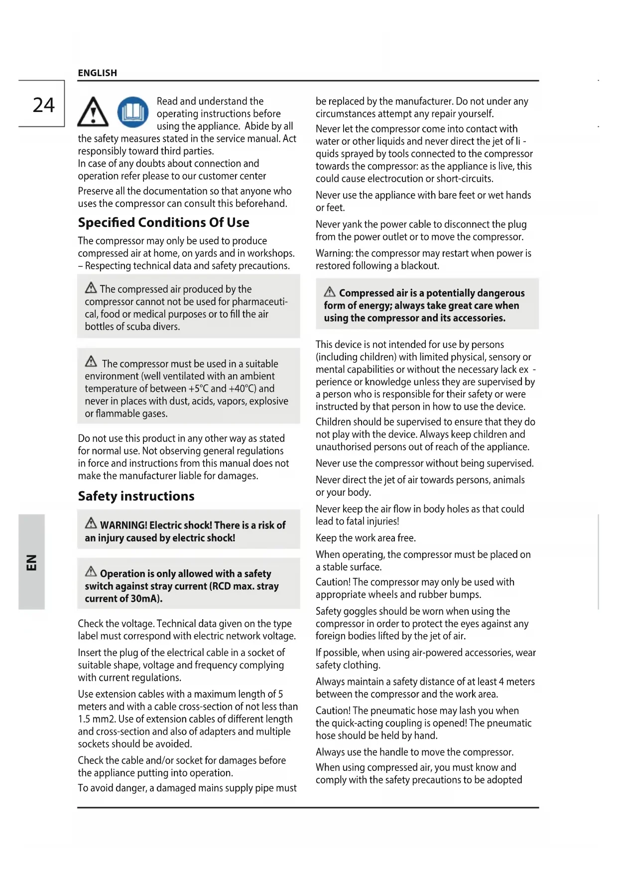 Read and understand the operating instructions before using the appliance. Abide by all the safety measures stated in the service manual. Act responsibly toward third parties. In case of any doubts about connection and operation refer please to our customer center Preserve all the documentation so that anyone who uses the compressor can consult this beforehand. Specied Conditions Of Use The compressor may only be used to produce compressed air at home, on yards and in workshops. – Respecting technical data and safety precautions. The compressed air produced by the compressor cannot not be used for pharmaceuti- cal, food or medical purposes or to ll the air bottles of scuba divers. The compressor must be used in a suitable environment (well ventilated with an ambient temperature of between +5°C and +40°C) and never in places with dust, acids, vapors, explosive or ammable gases. Do not use this product in any other way as stated for normal use. Not observing general regulations in force and instructions from this manual does not make the manufacturer liable for damages. Safety instructions WARNING! Electric shock! There is a risk of an injury caused by electric shock! Operation is only allowed with a safety switch against stray current (RCD max. stray current of 30mA). Check the voltage. Technical data given on the type label must correspond with electric network voltage. Insert the plug of the electrical cable in a socket of suitable shape, voltage and frequency complying with current regulations. Use extension cables with a maximum length of 5 meters and with a cable cross-section of not less than