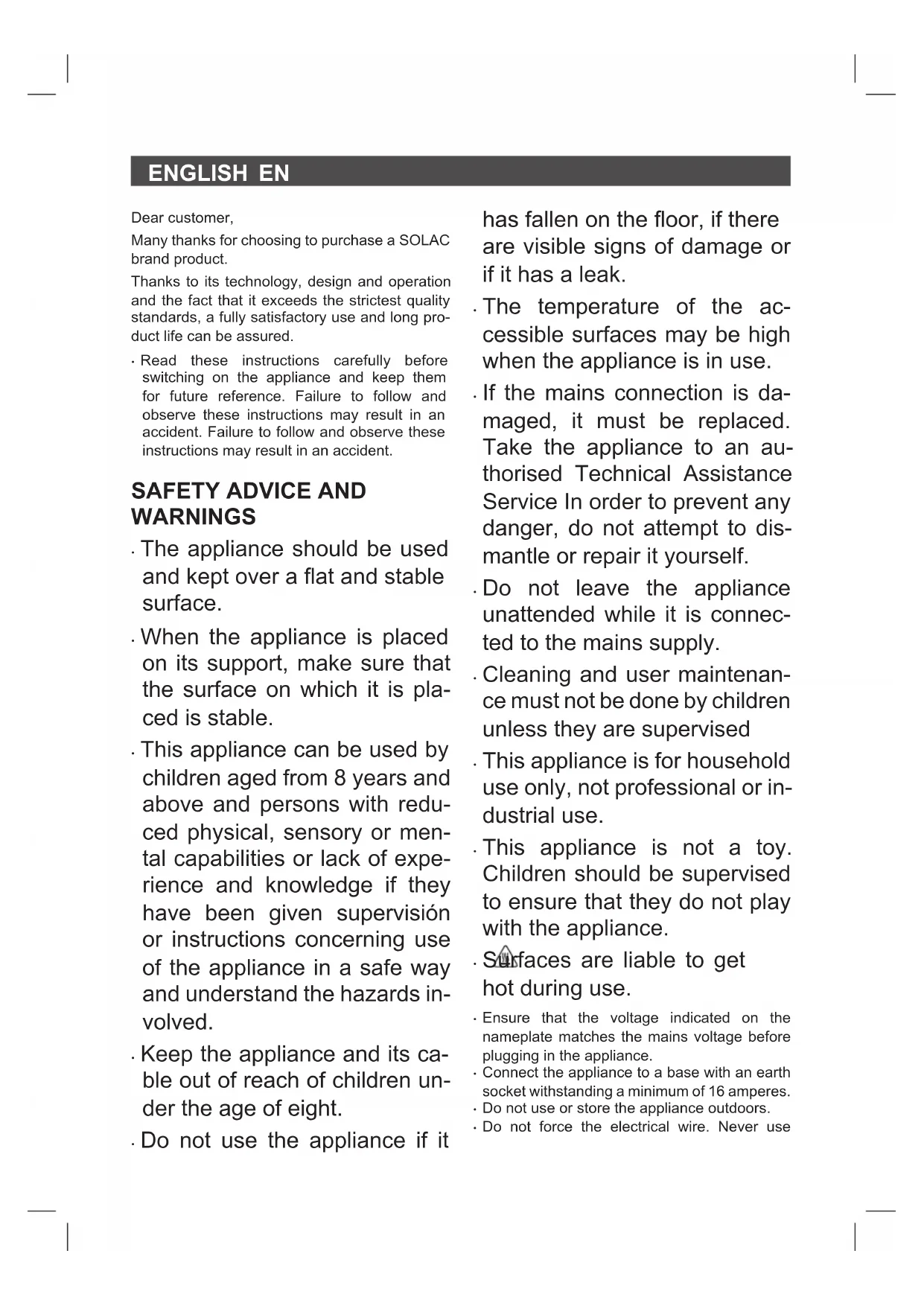 ASSISTANCE This product enjoys the recognition and protec- tion of the legal guarantee in accordance with current legislation. To enforce your rights or inte- rests you must go to any of our ofcial technical assistance services. You can nd the closest one by accessing the following web link: http://solac.com You can also request related information by con- tacting us by phone. You can download this instruction manual and its updates at http://solac.com