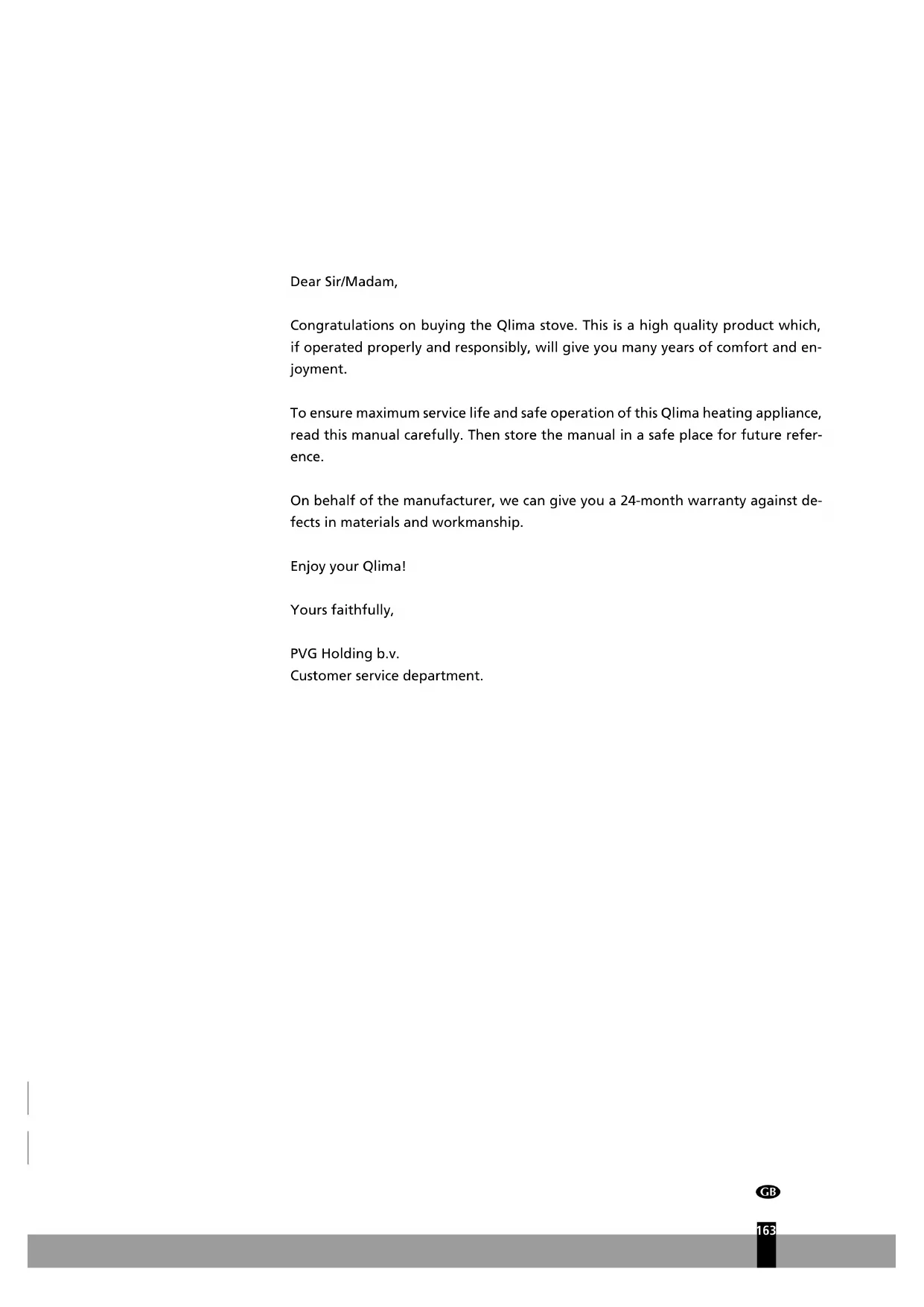 Dear Sir/Madam, Congratulations on buying the Qlima stove. This is a high quality product which, if operated properly and responsibly, will give you many years of comfort and en- joyment. To ensure maximum service life and safe operation of this Qlima heating appliance, read this manual carefully. Then store the manual in a safe place for future refer- ence. On behalf of the manufacturer, we can give you a 24-month warranty against de- fects in materials and workmanship. Enjoy your Qlima! Yours faithfully, PVG Holding b.v. Customer service department.