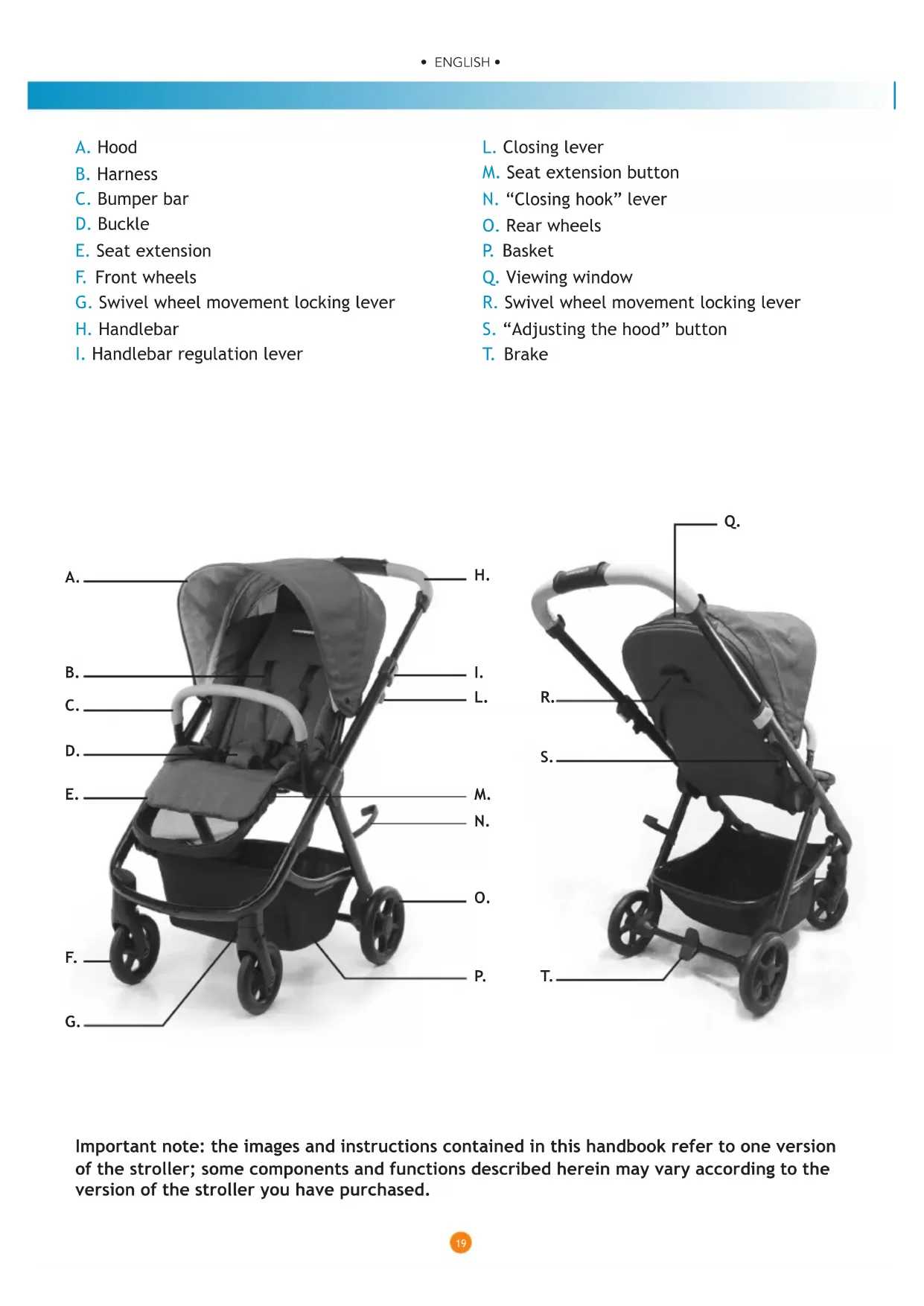 - ITALIANO • GARANZIA CONVENZIONALE Important note: the images and instructions contained in this handbook refer to one version of the stroller; some components and functions described herein may vary according to the version of the stroller you have purchased. A. Hood B. Harness C. Bumper bar D. Buckle E. Seat extension F. Front wheels G. Swivel wheel movement locking lever H. Handlebar