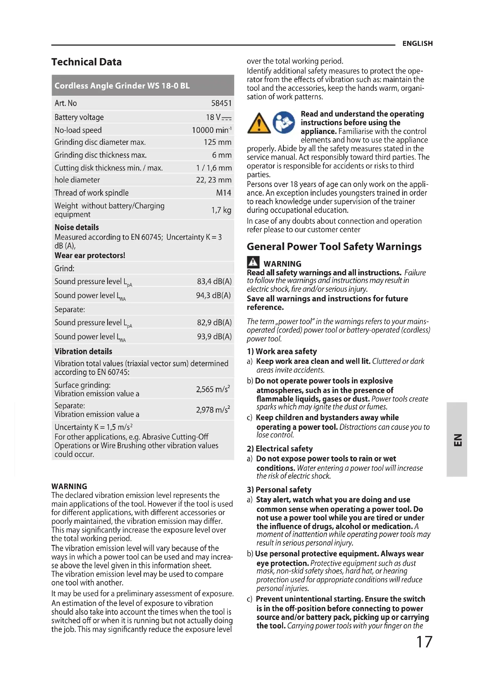 Grinding disc diameter max. 125 mm Grinding disc thickness max. 6 mm Cutting disk thickness min. / max. 1 / 1,6 mm hole diameter 22, 23 mm Thread of work spindle M14 Weight without battery/Charging equipment 1,7 kg Noise details Measured according to EN 60745; Uncertainty K = 3 dB(A), Wear ear protectors! Grind: Sound pressure level L