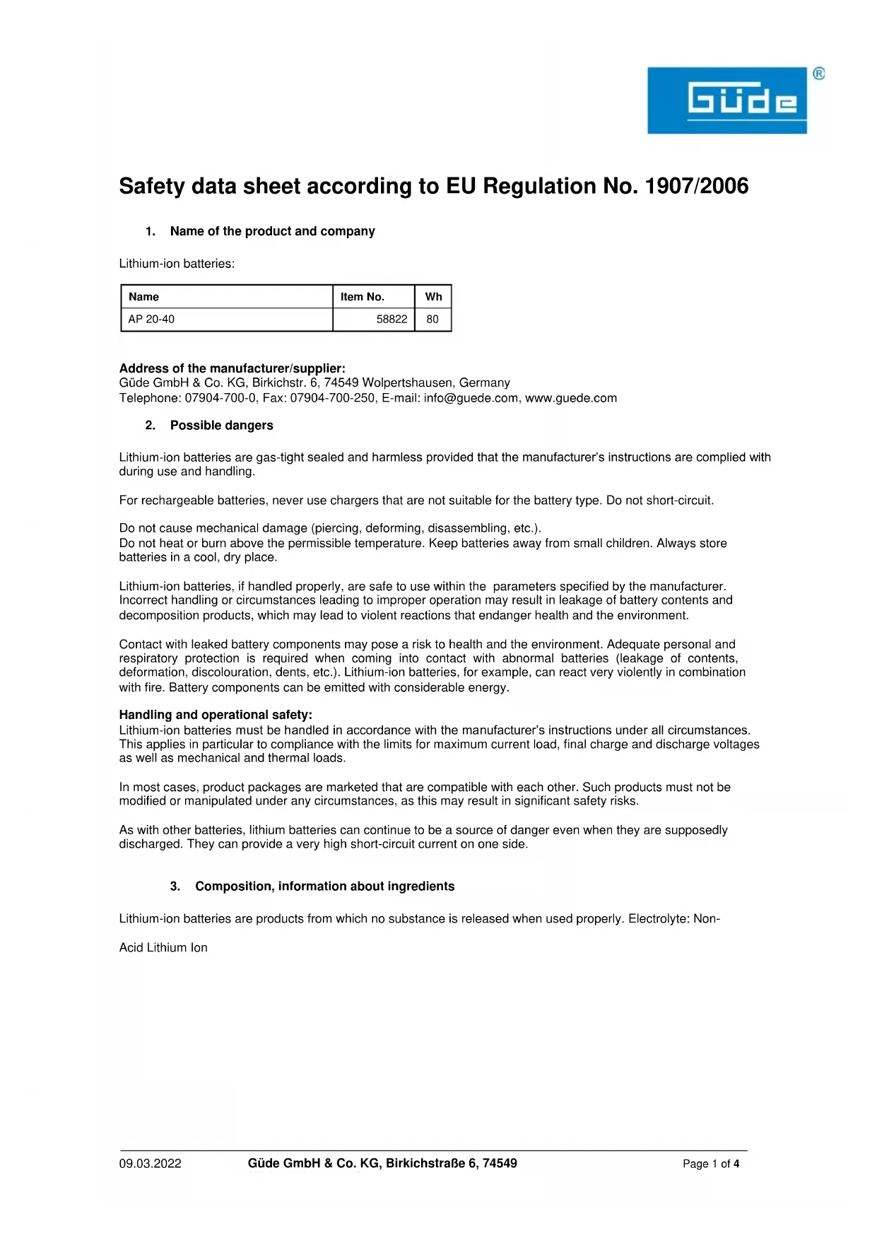 Physical and chemical properties The lithium-ion battery is a compact battery pack with a plastic coating.09.03.2022 Güde GmbH & Co. KG, Birkichstraße 6, 74549 Wolpertshausen, Germany Page 3 of 4