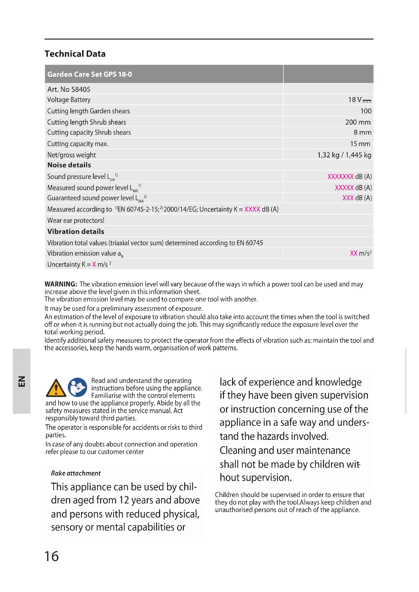 Specied Conditions of Use The device is intended for cutting lawn edges and smaller grass areas as well as hedge care for thin woody plants in private home and hobby gardens. The device must not be used for shredding compost material, as personal injury or damage to property could occur. The rake attachment is for loosening, aerating and weeding cultivated soils and narrow standing crops in a root-friendly way, as well as for preparing them for planting. It can also be used to work peat, fertiliser and compost into the soil. Do not use this product in any other way as stated for normal use. Not observing general regulations in force and instructions from this manual does not make the manufacturer liable for damages. WARNING Risk of injury The shrub shears must not be used for cutting grass, hard branches and wood or for shredding compost material. Grass / shrub shears attachment Requirements for operating sta The operating sta must carefully read the Opera- tingInstructions before using the appliance. This appliance has not been designed to be used by persons (including children) with reduced physical, sensory or mental capabilities or with a lack of know- ledge or experience. Qualication:: Apart from the detailed instructions by aprofessional, no special qualication is necessary forappliance using. Minimum age:: Persons over 16 years of age can only workon the appliance.An exception includes youngsters trained in order to reachknowledge under supervision of the trainer duringoccupational education. Local regulations may stipulate the minimum age of the user. Training:: Using the appliance only requires corre- spondingtraining by a professional or the Operating Instructions. Nospecial training is necessary. Residual Risk Even when the device is used properly and all safety regulations are complied with, there still may be some residual risks.
