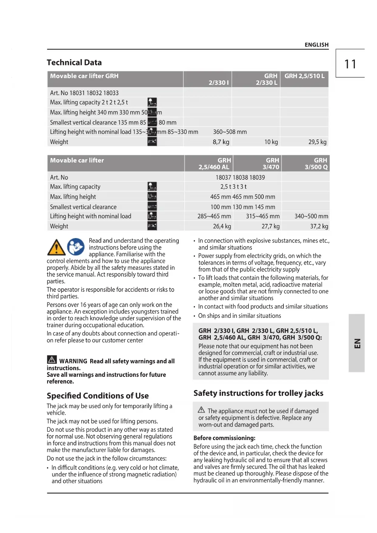 ENGLISH Technical Data Movable car lifter GRH 2/330 I GRH 2/330 L GRH 2,5/510 L Art. No 18031 18032 18033 Max. lifting capacity 2 t 2 t 2,5 t Max. lifting height 340 mm 330 mm 508 mm Smallest vertical clearance 135 mm 85 mm 80 mm Lifting height with nominal load 135~340 mm 85~330 mm 360~508 mm Weight 8,7 kg 10 kg 29,5 kg Movable car lifter GRH 2,5/460 AL GRH 3/470 GRH 3/500 Q Art. No 18037 18038 18039 Max. lifting capacity 2,5 t 3 t 3 t Max. lifting height 465 mm 465 mm 500 mm Smallest vertical clearance 100 mm 130 mm 145 mm Lifting height with nominal load 285~465 mm 315~465 mm 340~500 mm Weight 26,4 kg 27,7 kg 37,2 kg Read and understand the operating instructions before using the appliance. Familiarise with the control elements and how to use the appliance properly. Abide by all the safety measures stated in the service manual. Act responsibly toward third parties. The operator is responsible for accidents or risks to third parties. Persons over 16 years of age can only workon the appliance.An exception includes youngsters trained in order to reachknowledge under supervision of the trainer duringoccupational education. In case of any doubts about connection and operati