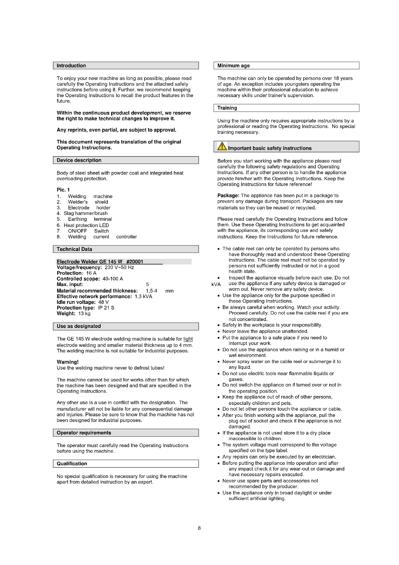 Technical Data Electrode Welder GE 145 W #20001 Voltage/frequency: 230 V~50 Hz Protection: 16 A Controlled scope: 40-100 A Max. input: 5 kVA Material recommended thickness: 1,5-4 mm Effective network performance: 1,3 kVA Idle run voltage: 48 V Protection type: IP 21 S Weight: 13 kg Use as designated The GE 145 W electrode welding machine is suitable for light electrode welding and smaller material thickness up to 4 mm. The welding machine is not suitable for industrial purposes. Warning! Use the welding machine never to defrost tubes! The machine cannot be used for works other than for which the machine has been designed and that are specified in the Operating Instructions. Any other use is a use in conflict with the designation. The manufacturer will not be liable for any consequential damage and injuries. Please be sure to know that the machine has not been designed for industrial purposes. Operator requirements The operator must carefully read the Operating Instructions before using the machine. Qualification No special qualification is necessary for using the machine apart from detailed instruction by an expert.