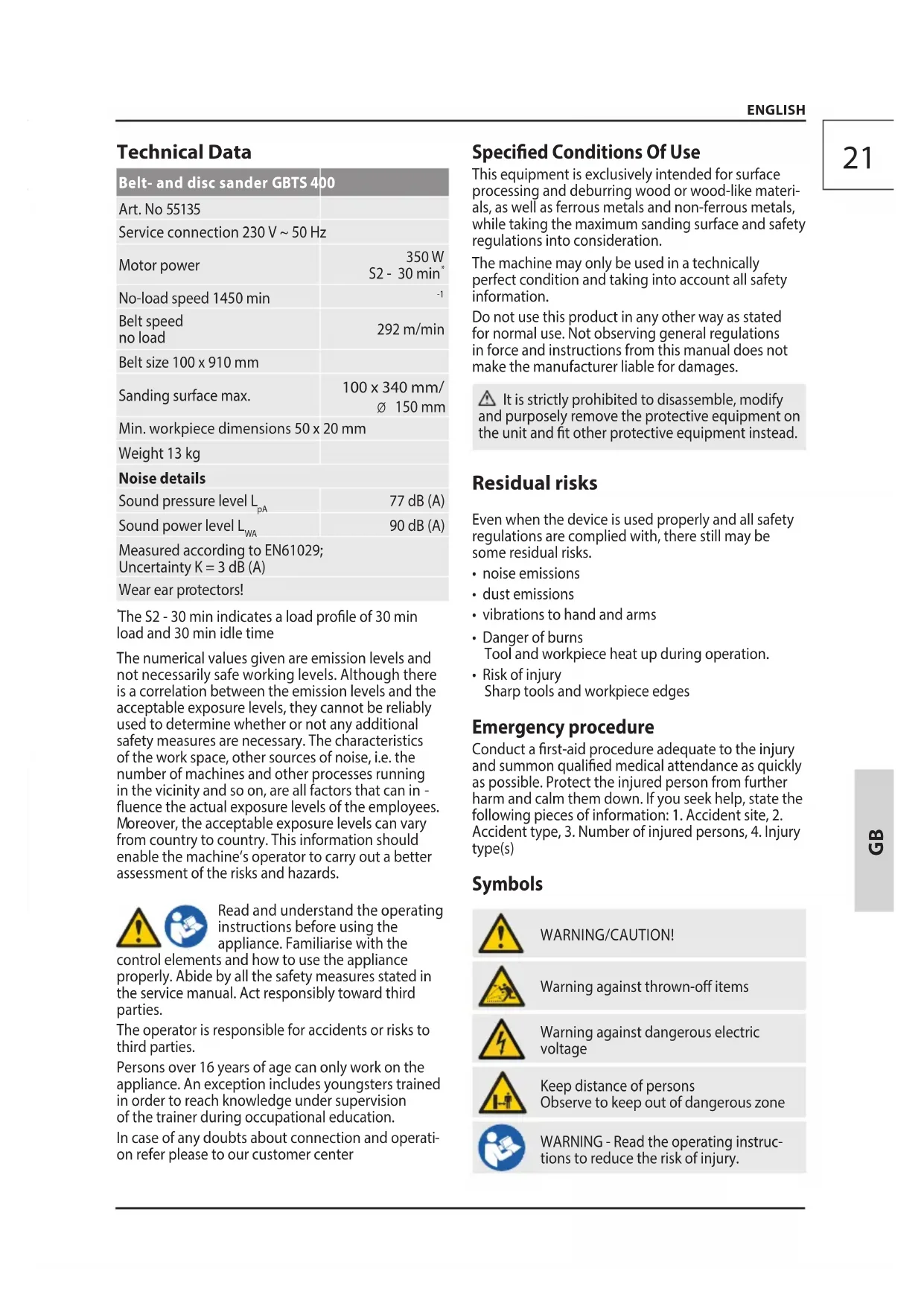 on refer please to our customer center Specied Conditions Of Use This equipment is exclusively intended for surface processing and deburring wood or wood-like materi- als, as well as ferrous metals and non-ferrous metals, while taking the maximum sanding surface and safety regulations into consideration. The machine may only be used in a technically perfect condition and taking into account all safety information. Do not use this product in any other way as stated for normal use. Not observing general regulations in force and instructions from this manual does not make the manufacturer liable for damages. It is strictly prohibited to disassemble, modify and purposely remove the protective equipment on the unit and t other protective equipment instead. Residual risks Even when the device is used properly and all safety regulations are complied with, there still may be some residual risks.