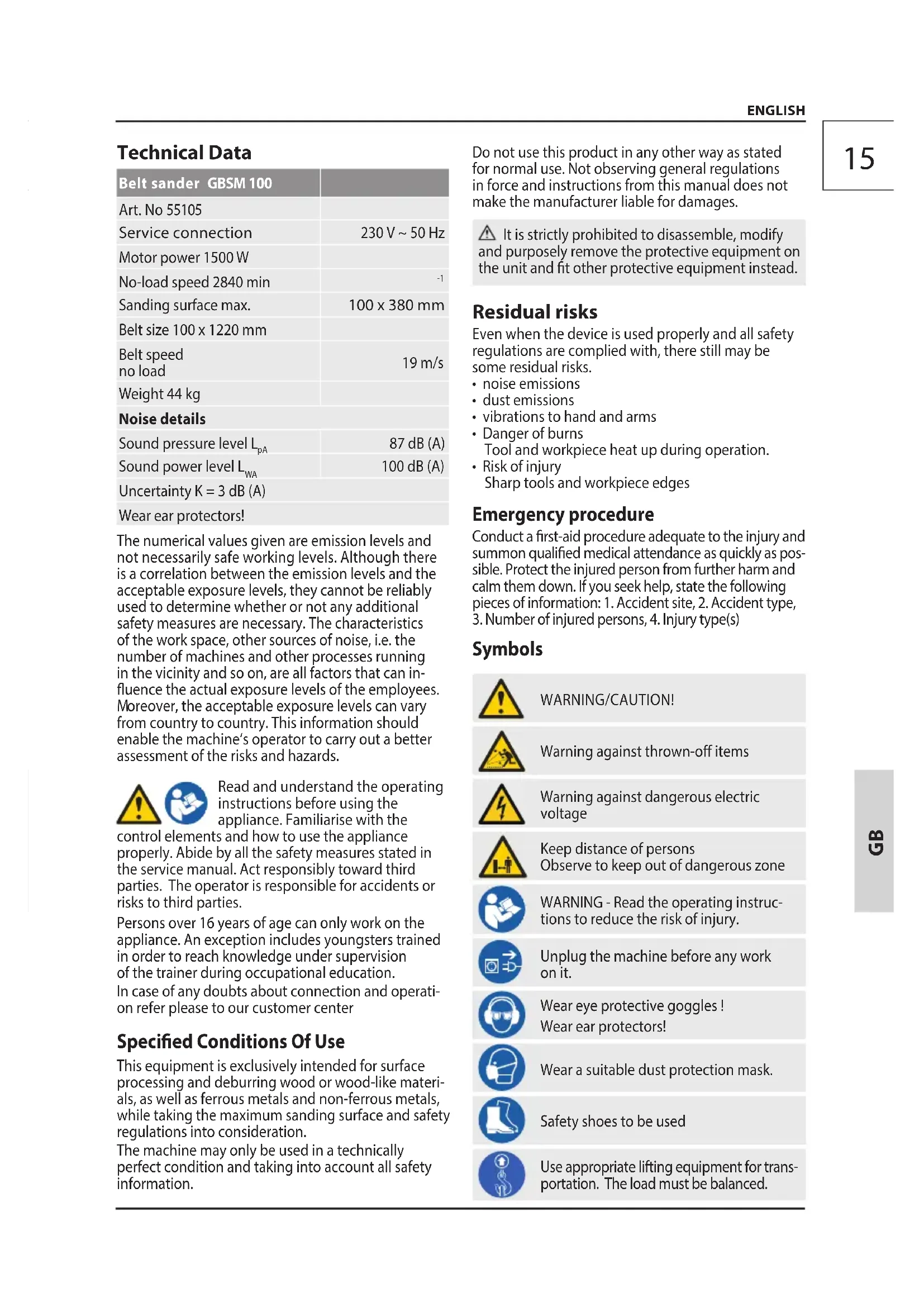 oreover, the acceptable exposure levels can vary from country to country. This information should enable the machine‘s operator to carry out a better assessment of the risks and hazards. Read and understand the operating instructions before using the appliance. Familiarise with the control elements and how to use the appliance properly. Abide by all the safety measures stated in the service manual. Act responsibly toward third parties. The operator is responsible for accidents or risks to third parties. Persons over 16 years of age can only workon the appliance.An exception includes youngsters trained in order to reachknowledge under supervision of the trainer duringoccupational education. In case of any doubts about connection and operati- on refer please to our customer center Specied Conditions Of Use This equipment is exclusively intended for surface processing and deburring wood or wood-like materi- als, as well as ferrous metals and non-ferrous metals, while taking the maximum sanding surface and safety regulations into consideration. The machine may only be used in a technically perfect condition and taking into account all safety information. Do not use this product in any other way as stated for normal use. Not observing general regulations in force and instructions from this manual does not make the manufacturer liable for damages. It is strictly prohibited to disassemble, modify and purposely remove the protective equipment on the unit and t other protective equipment instead. Residual risks Even when the device is used properly and all safety regulations are complied with, there still may be some residual risks.