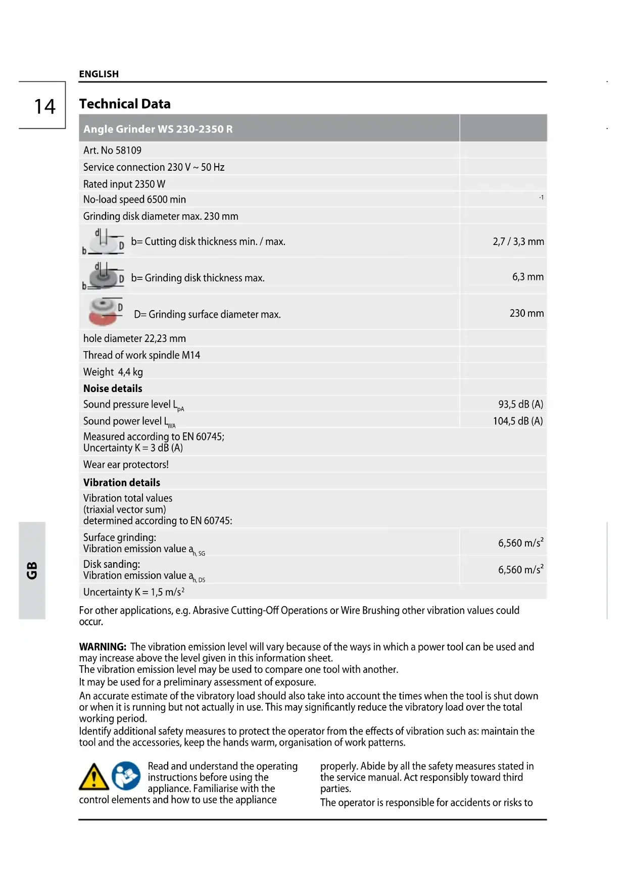 may increase above the level given in this information sheet. The vibration emission level may be used to compare one tool with another. It may be used for a preliminary assessment of exposure. An accurate estimate of the vibratory load shouldalso take into account the times when the tool isshut down or when it is running but not actually inuse. This may signicantly reduce the vibratoryload over the total working period. Identify additional safety measures to protect theoperator from the eects of vibration such as:maintain the tool and the accessories, keep thehands warm, organisation of work patterns. Read and understand the operating instructions before using the appliance. Familiarise with the control elements and how to use the appliance properly. Abide by all the safety measures stated in the service manual. Act responsibly toward third parties. The operator is responsible for accidents or risks toD
