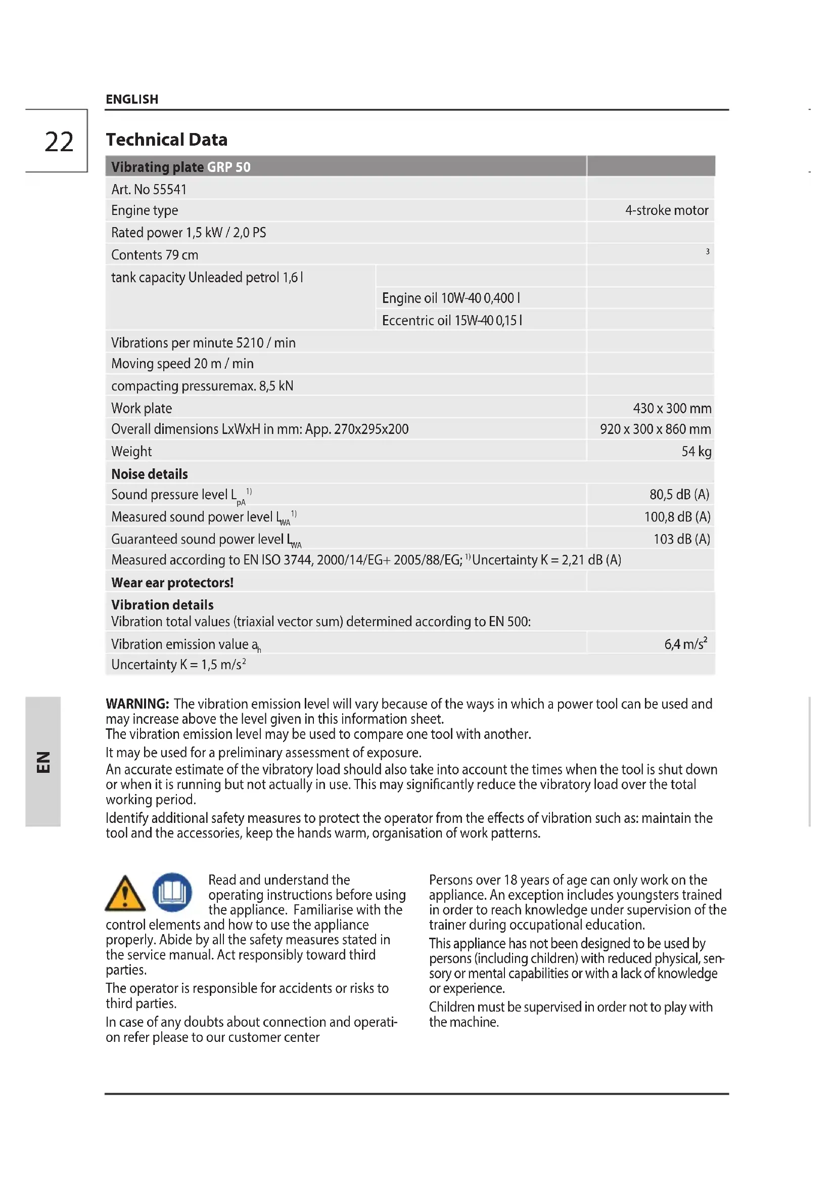 gerours carbon monoxide gases may accumulate. Risk of explosion!! Petrol and petrol vapours are highly ammable, explosive. Do not work with the unit in an environment with a risk of explosion where there are ammable liquids, gases or dust. Refuel the engine only when switched o. Do not store any fuel near the unit. Never keep the unit with petrol in the tank inside a building where petrol vapours could get in contact with open re or sparks. Hearing damage A longer stay in the immediate vicinity of the running unit may cause hearing damage. Wear ear protectors! Risk of crushing Keep hands and feet away from moving parts. Wear safety shoes with steel reinforcement!24 ENGLISH