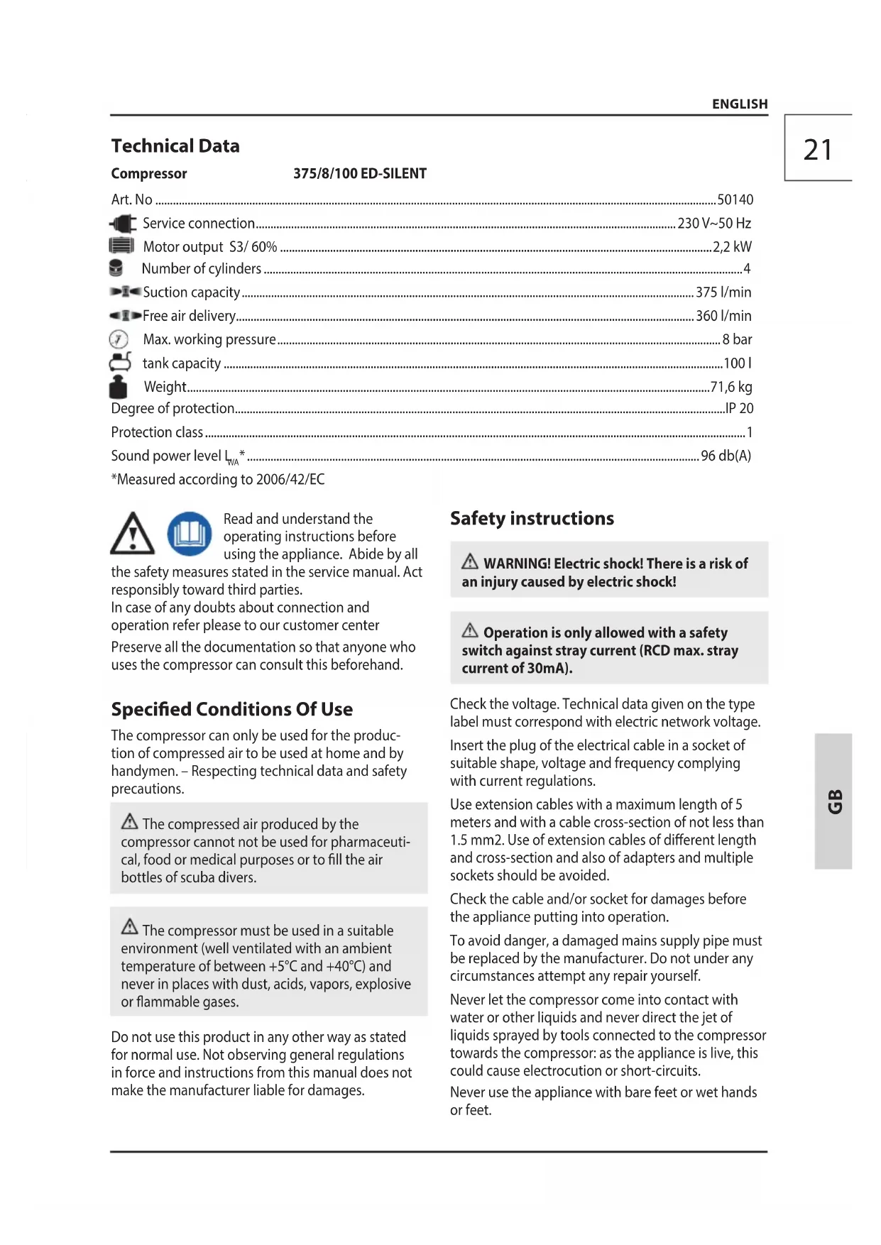 - .......................................................................................................................................................... 96 db(A) *Measured according to 2006/42/EC Read and understand the operating instructions before using the appliance. Abide by all the safety measures stated in the service manual. Act responsibly toward third parties. In case of any doubts about connection and operation refer please to our customer center Preserve all the documentation so that anyone who uses the compressor can consult this beforehand. Specied Conditions Of Use The compressor can only be used for the produc- tion of compressed air to be used at home and by handymen. – Respecting technical data and safety precautions. The compressed air produced by the compressor cannot not be used for pharmaceuti- cal, food or medical purposes or to ll the air bottles of scuba divers. The compressor must be used in a suitable environment (well ventilated with an ambient temperature of between +5°C and +40°C) and never in places with dust, acids, vapors, explosive or ammable gases. Do not use this product in any other way as stated for normal use. Not observing general regulations in force and instructions from this manual does not make the manufacturer liable for damages. Safety instructions WARNING! Electric shock! There is a risk of an injury caused by electric shock! Operation is only allowed with a safety switch against stray current (RCD max. stray current of 30mA). Check the voltage. Technical data given on the type label must correspond with electric network voltage. Insert the plug of the electrical cable in a socket of suitable shape, voltage and frequency complying with current regulations. Use extension cables with a maximum length of 5 meters and with a cable cross-section of not less than