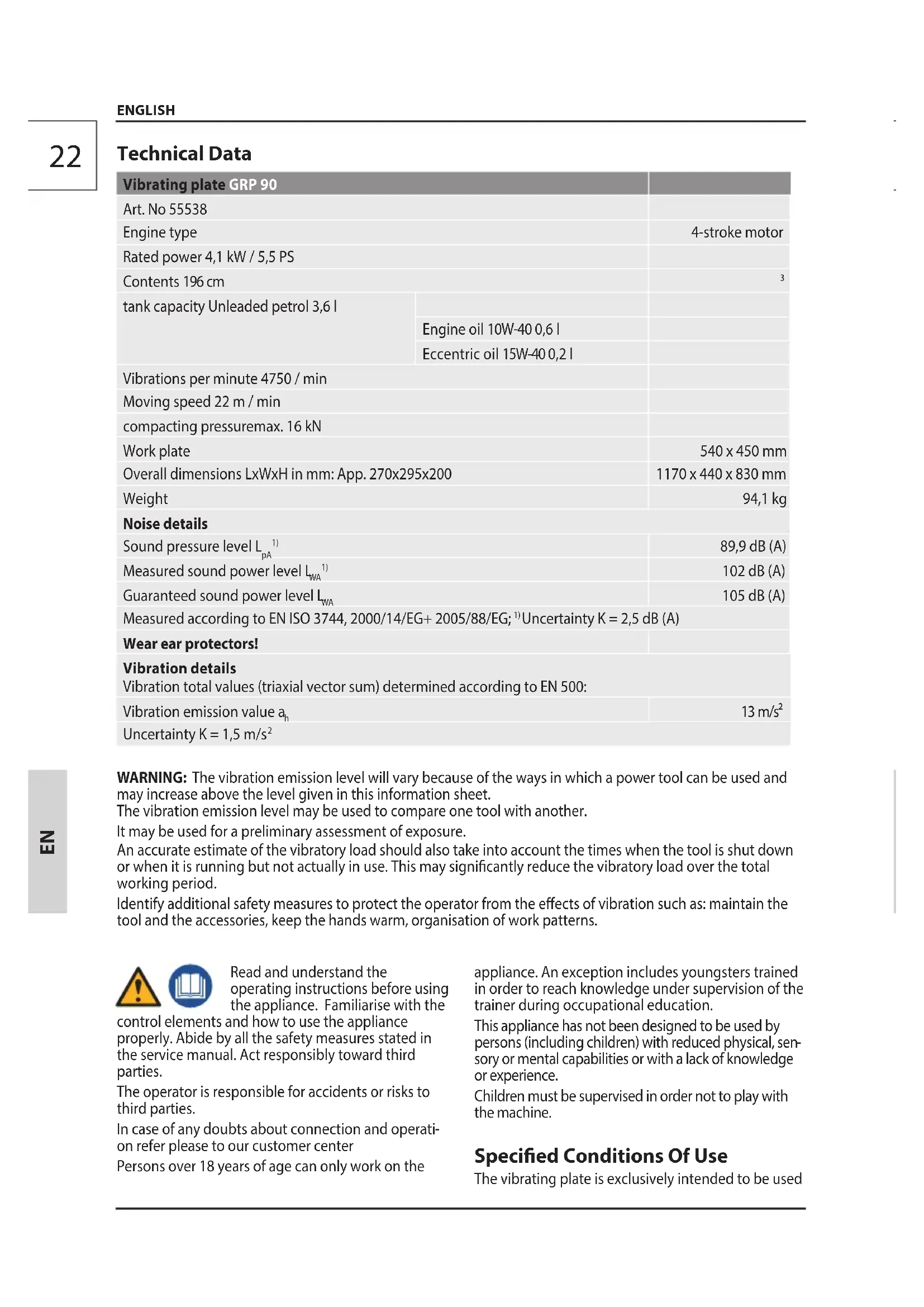 sory or mental capabilities or with a lack of knowledge or experience. Children must be supervised in order not to play with the machine. Specied Conditions Of Use The vibrating plate is exclusively intended to be used23 ENGLISH