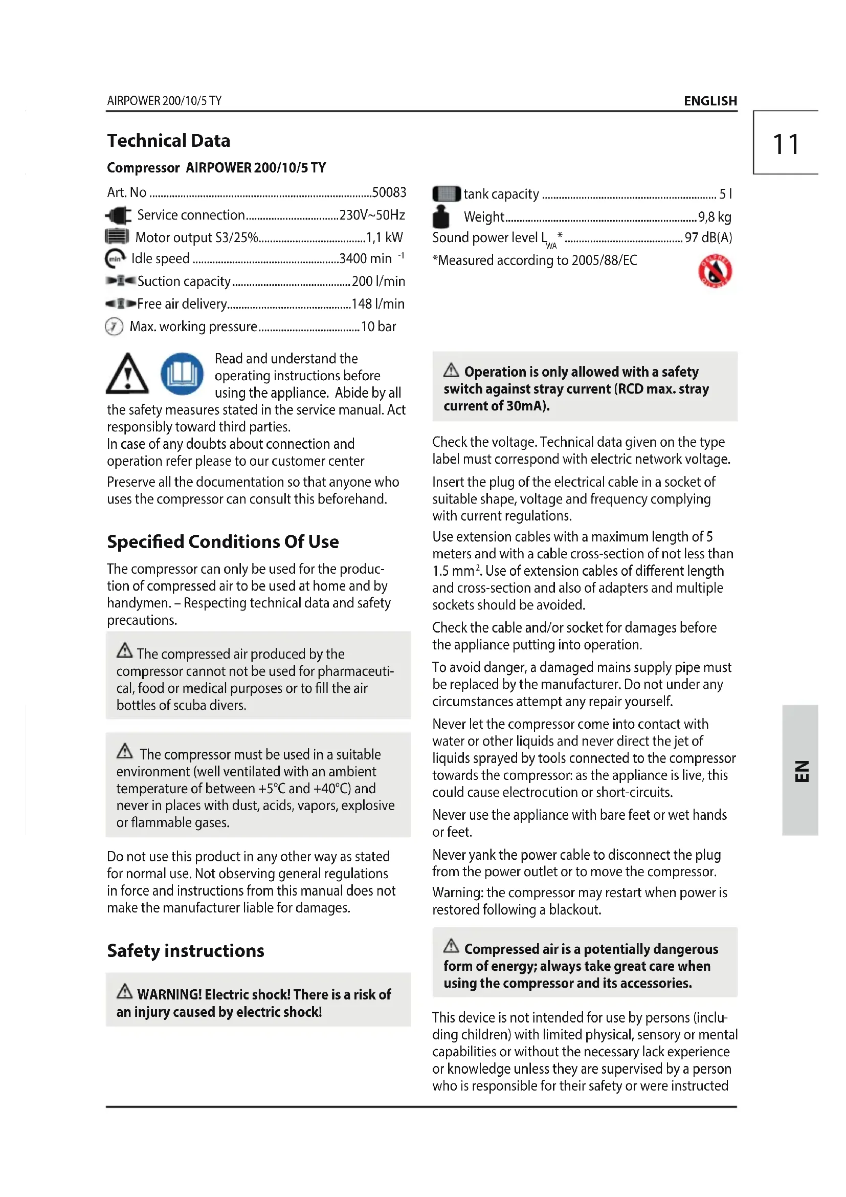 - Read and understand the operating instructions before using the appliance. Abide by all the safety measures stated in the service manual. Act responsibly toward third parties. In case of any doubts about connection and operation refer please to our customer center Preserve all the documentation so that anyone who uses the compressor can consult this beforehand. Specied Conditions Of Use The compressor can only be used for the produc- tion of compressed air to be used at home and by handymen. – Respecting technical data and safety precautions. The compressed air produced by the compressor cannot not be used for pharmaceuti- cal, food or medical purposes or to ll the air bottles of scuba divers. The compressor must be used in a suitable environment (well ventilated with an ambient temperature of between +5°C and +40°C) and never in places with dust, acids, vapors, explosive or ammable gases. Do not use this product in any other way as stated for normal use. Not observing general regulations in force and instructions from this manual does not make the manufacturer liable for damages. Safety instructions WARNING! Electric shock! There is a risk of an injury caused by electric shock! ENGLISH Technical Data Compressor AIRPOWER 200/10/5 TY Art. No p. 5008