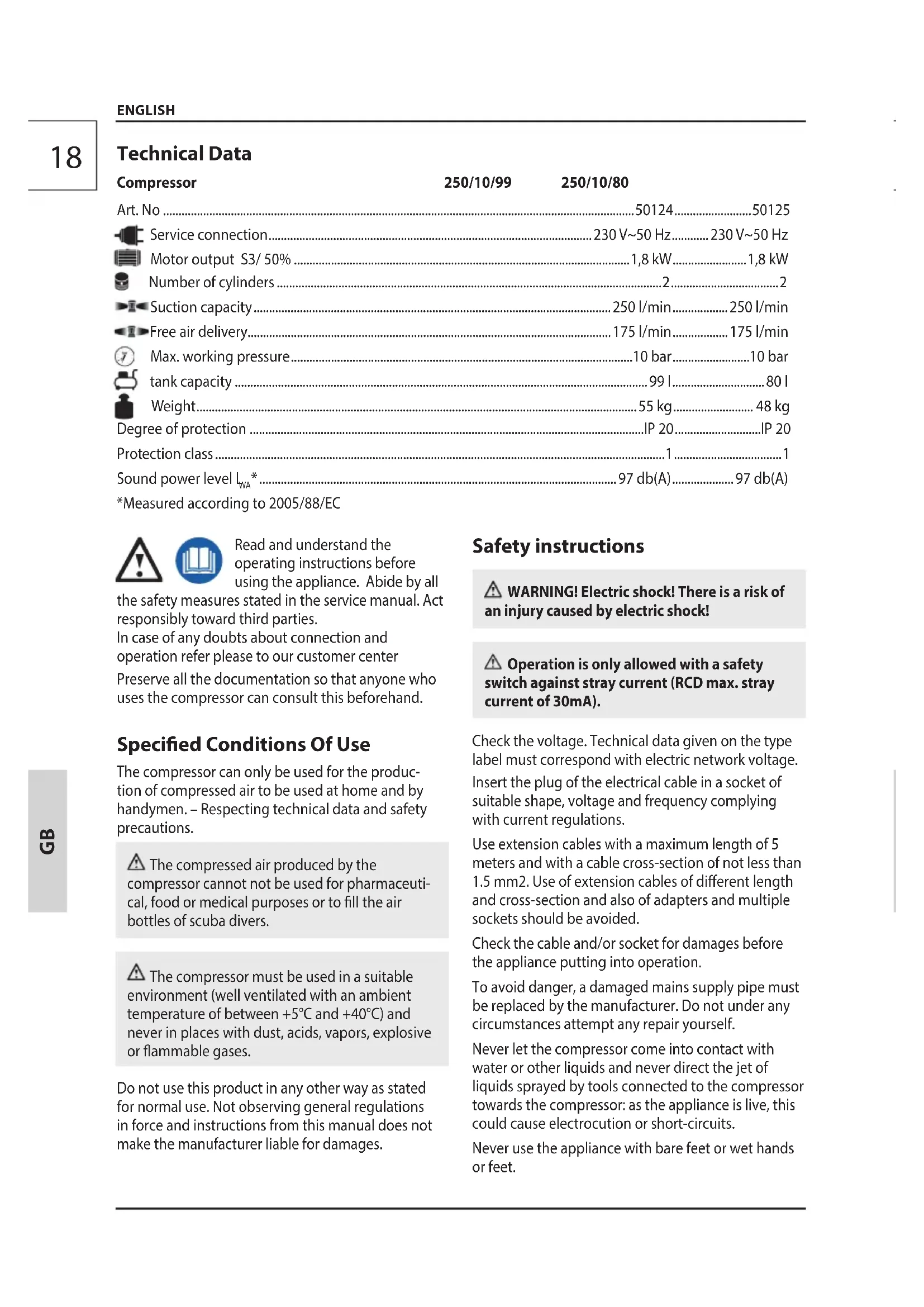 - .................................................................................................................... 97 db(A) ....................97 db(A) *Measured according to 2005/88/EC Technical Data Compressor 250/10/99 250/10/8019 Caution! Never switch the compressor on or o using the plug. Pressure switch to be pressed at all times. Do not leave the compressor on over night as it could become a source of danger. At the end of your working day, switch the appliance o, release the air jet and unplug the compressor.