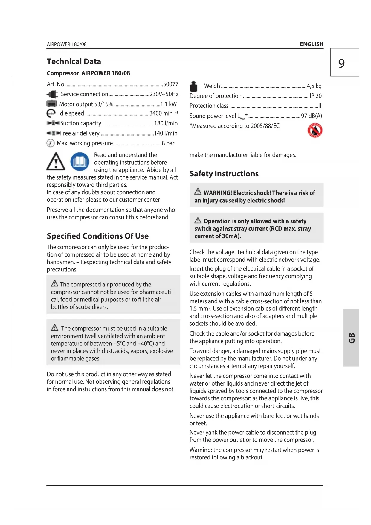 Read and understand the operating instructions before using the appliance. Abide by all the safety measures stated in the service manual. Act responsibly toward third parties. In case of any doubts about connection and operation refer please to our customer center Preserve all the documentation so that anyone who uses the compressor can consult this beforehand. Specied Conditions Of Use The compressor can only be used for the produc- tion of compressed air to be used at home and by handymen. – Respecting technical data and safety precautions. The compressed air produced by the compressor cannot not be used for pharmaceuti- cal, food or medical purposes or to ll the air bottles of scuba divers. The compressor must be used in a suitable environment (well ventilated with an ambient temperature of between +5°C and +40°C) and never in places with dust, acids, vapors, explosive or ammable gases. Do not use this product in any other way as stated for normal use. Not observing general regulations in force and instructions from this manual does not make the manufacturer liable for damages. Safety instructions WARNING! Electric shock! There is a risk of an injury caused by electric shock! Operation is only allowed with a safety switch against stray current (RCD max. stray current of 30mA). Check the voltage. Technical data given on the type label must correspond with electric network voltage. Insert the plug of the electrical cable in a socket of suitable shape, voltage and frequency complying with current regulations. Use extension cables with a maximum length of 5 meters and with a cable cross-section of not less than