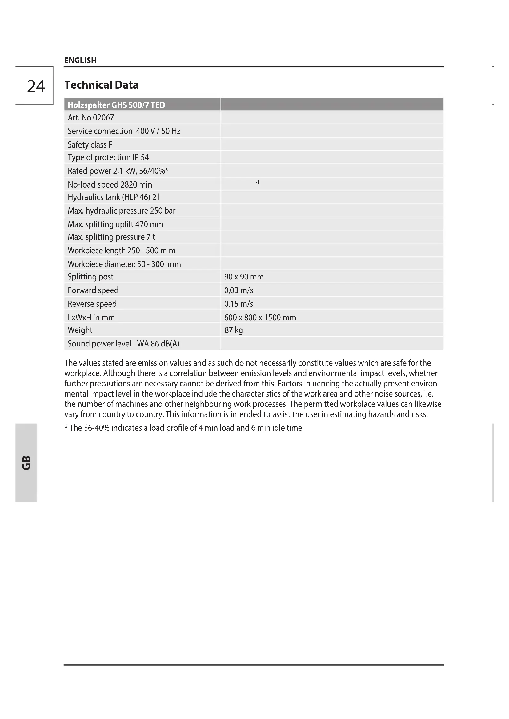Hydraulics tank (HLP 46) 2 l Max. hydraulic pressure 250 bar Max. splitting uplift 470 mm Max. splitting pressure 7 t Workpiece length 250 - 500 m m Workpiece diameter: 50 - 300 mm Splitting post 90 x 90 mm Forward speed 0,03 m/s Reverse speed 0,15 m/s LxWxH in mm 600 x 800 x 1500 mm Weight 87 kg Sound power level LWA 86 dB(A) The values stated are emission values and as such do not necessarily constitute values which are safe for the workplace. Although there is a correlation between emission levels and environmental impact levels, whether further precautions are necessary cannot be derived from this. Factors in uencing the actually present environ