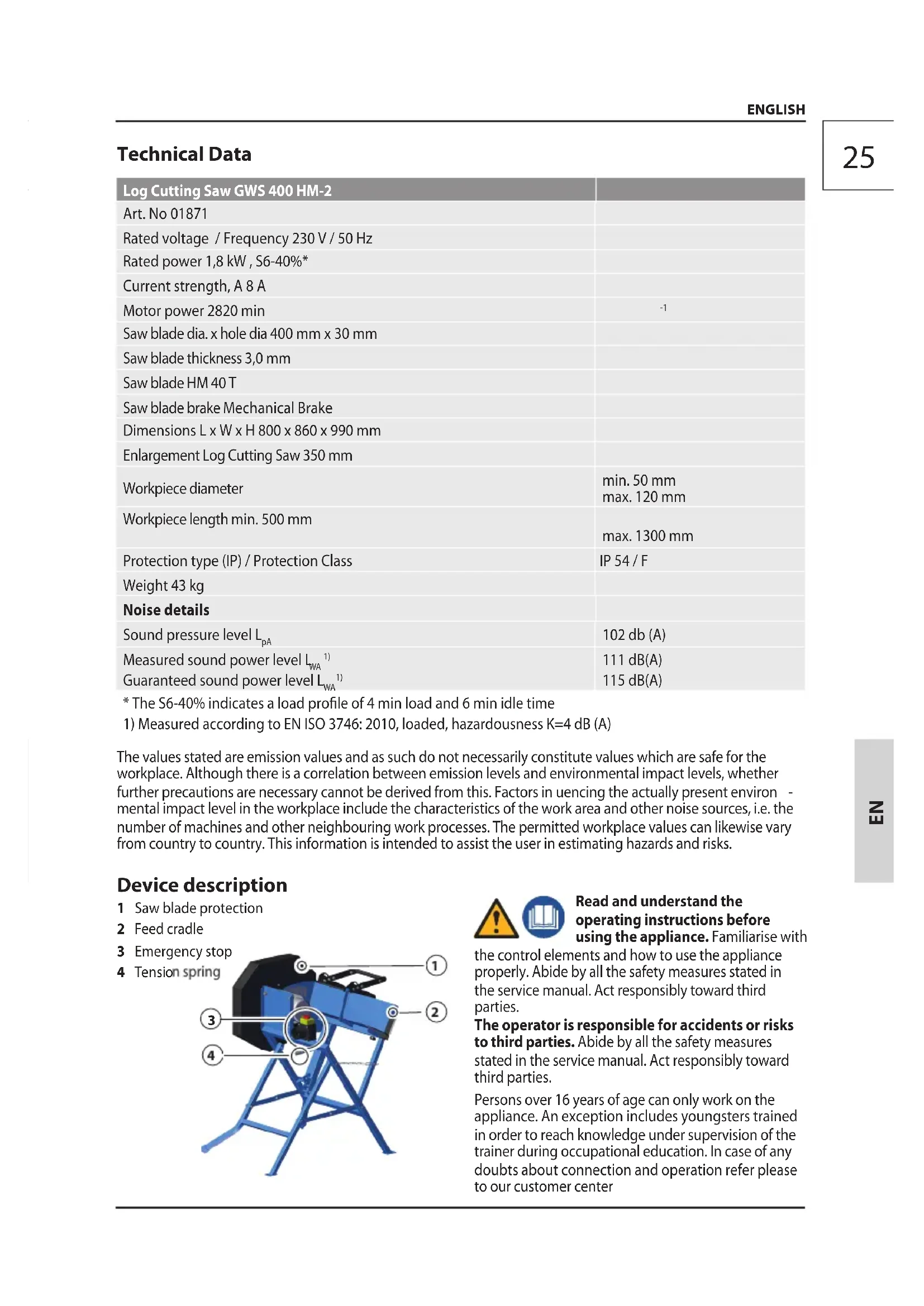 mental impact level in the workplace include the characteristics of the work area and other noise sources, i.e. the number of machines and other neighbouring work processes. The permitted workplace values can likewise vary from country to country. This information is intended to assist the user in estimating hazards and risks. Device description 1 Saw blade protection 2 Feed cradle 3 Emergency stop 4 Tension spring