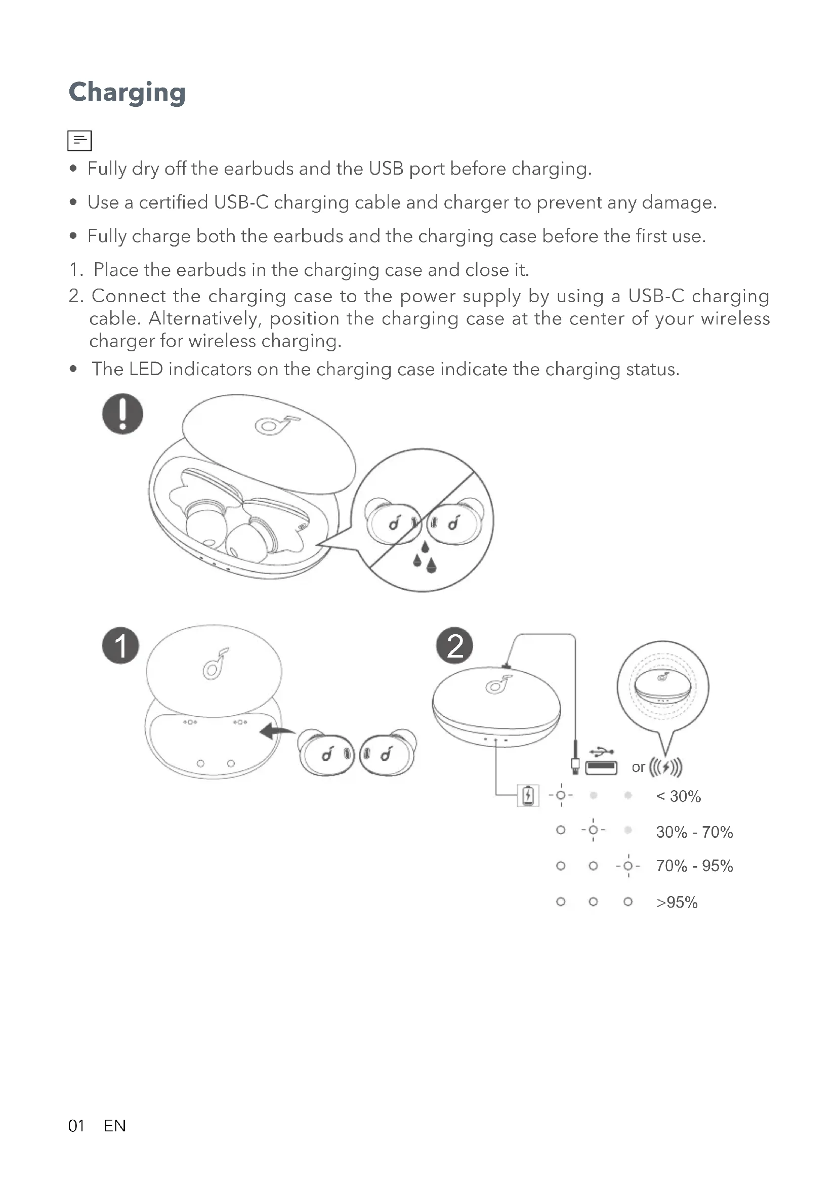 - The LED indicators on the charging case indicate the charging status. < 30% 30% - 70% 70% - 95% >95%