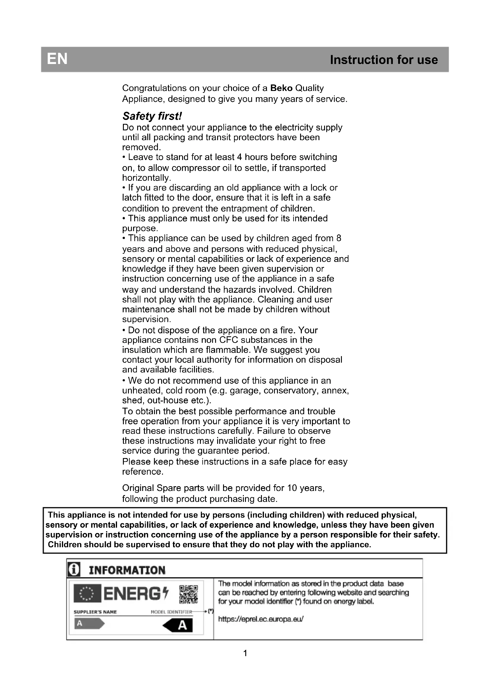 - We do not recommend use of this appliance in an unheated, cold room (e.g. garage, conservatory, annex, shed, out-house etc.). To obtain the best possible performance and trouble free operation from your appliance it is very important to read these instructions carefully. Failure to observe these instructions may invalidate your right to free service during the guarantee period. Please keep these instructions in a safe place for easy reference. Original Spare parts will be provided for 10 years, following the product purchasing date.