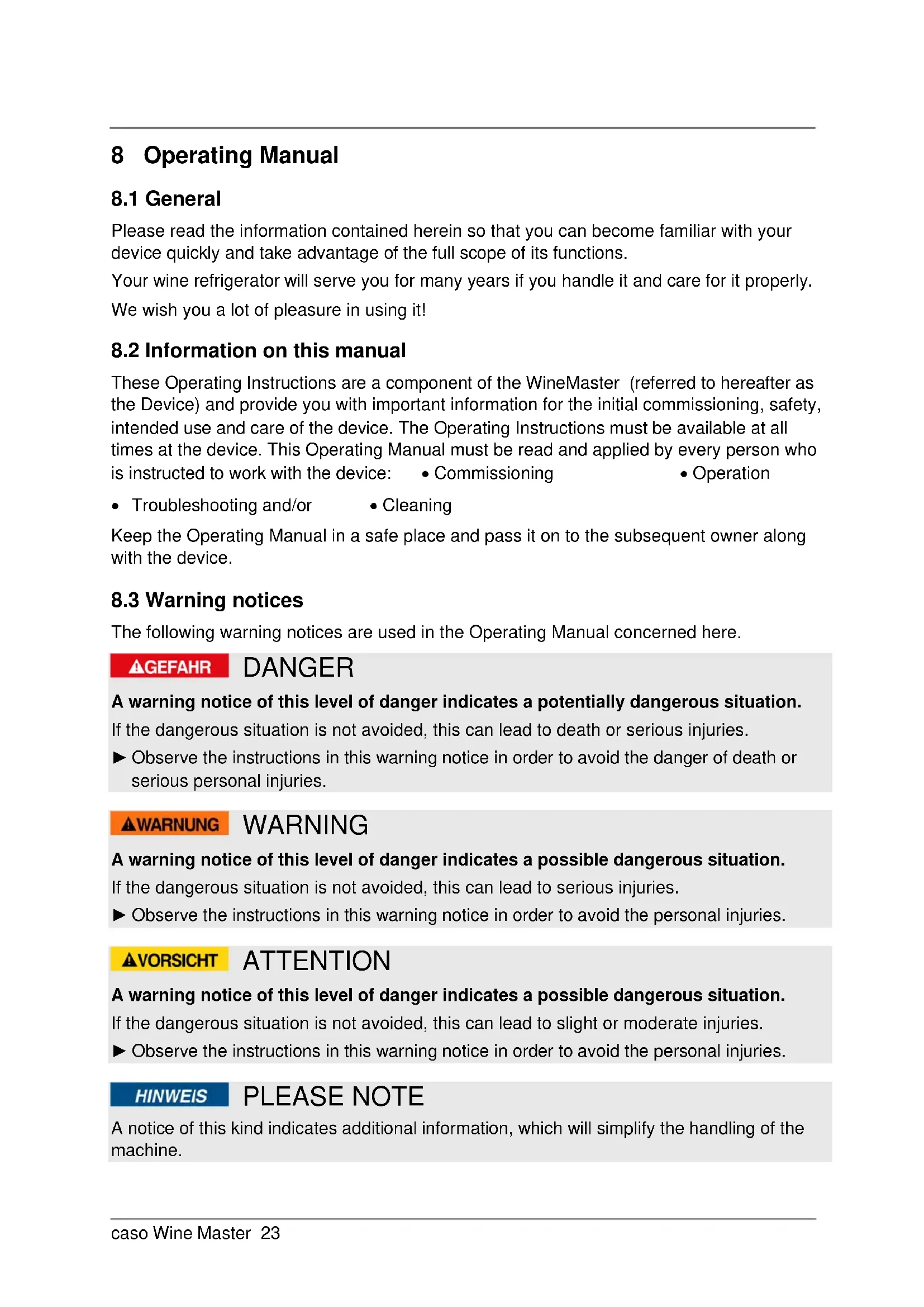 The following warning notices are used in the Operating Manual concerned here. DANGER A warning notice of this level of danger indicates a potentially dangerous situation. If the dangerous situation is not avoided, this can lead to death or serious injuries. ► Observe the instructions in this warning notice in order to avoid the danger of death or serious personal injuries. WARNING A warning notice of this level of danger indicates a possible dangerous situation. If the dangerous situation is not avoided, this can lead to serious injuries. ► Observe the instructions in this warning notice in order to avoid the personal injuries. ATTENTION A warning notice of this level of danger indicates a possible dangerous situation. If the dangerous situation is not avoided, this can lead to slight or moderate injuries. ► Observe the instructions in this warning notice in order to avoid the personal injuries. PLEASE NOTE A notice of this kind indicates additional information, which will simplify the handling of the machine.caso Wine Master 24