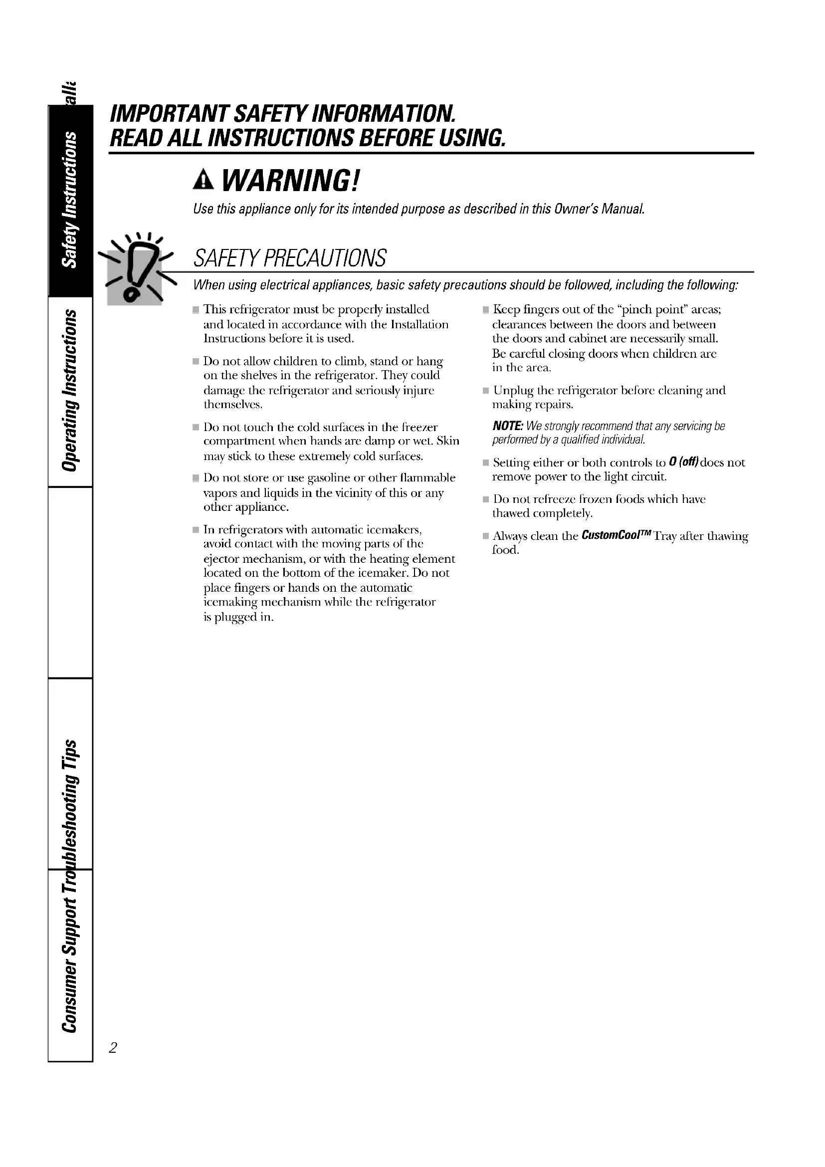 ■ This refrigerator must be properly installed and located in accordance with the InstallationInstructions before it is used. ■ Do not allow children to climb, stand or hang on the shelves in the refrigerator. They coulddamage the refrigerator and seriously injurethemselves. ■ Do not touch the cold surfaces in the freezercompartment when hands are damp or wet. Skinmay stick to these extremely cold surfaces. ■ Do not store or use gasoline or other flammablevapors and liquids in the vicinity of this or anyother appliance. ■ In refrigerators with automatic icemakers, avoid contact with the moving parts of the ejector mechanism, or with the heating elementlocated on the bottom of the icemaker. Do notplace fingers or hands on the automaticicemaking mechanism while the refrigerator is plugged in. ■ Keep fingers out of the “pinch point” areas;clearances between the doors and between the doors and cabinet are necessarily small. Be careful closing doors when children are in the area. ■ Unplug the refrigerator before cleaning andmaking repairs.NOTE: We strongly recommend that any servicing beperformed by a qualified individual. ■ Setting either or both controls to O (off) does notremove power to the light circuit. ■ Do not refreeze frozen foods which have thawed completely. ■ Always clean the CustomCool™Tray after thawingfood.Consumer SupportTroubleshooting Tips Operating Instructions Safety Instructions Installation Instructions www.GEAppliances.com