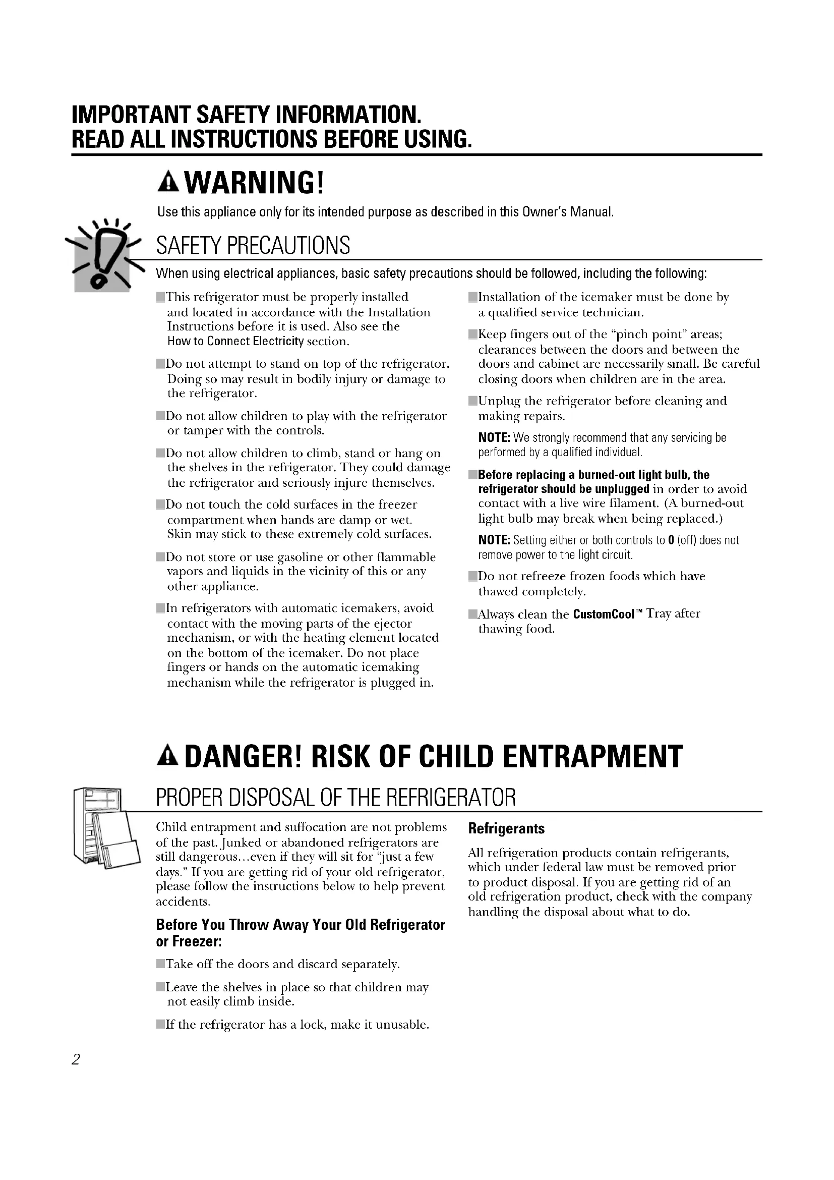 Child entrapment and suffocation are not problems of the past. Junked or abandoned refrigerators are still dangerous…even if they will sit for “just a few days.” If you are getting rid of your old refrigerator, please follow the instructions below to help prevent accidents. Before You Throw Away Your Old Refrigerator or Freezer: ■ Take off the doors and discard separately. ■ Leave the shelves in place so that children may not easily climb inside. ■ If the refrigerator has a lock, make it unusable. Refrigerants All refrigeration products contain refrigerants, which under federal law must be removed prior to product disposal. If you are getting rid of an old refrigeration product, check with the company handling the disposal about what to do.3 WARNING!